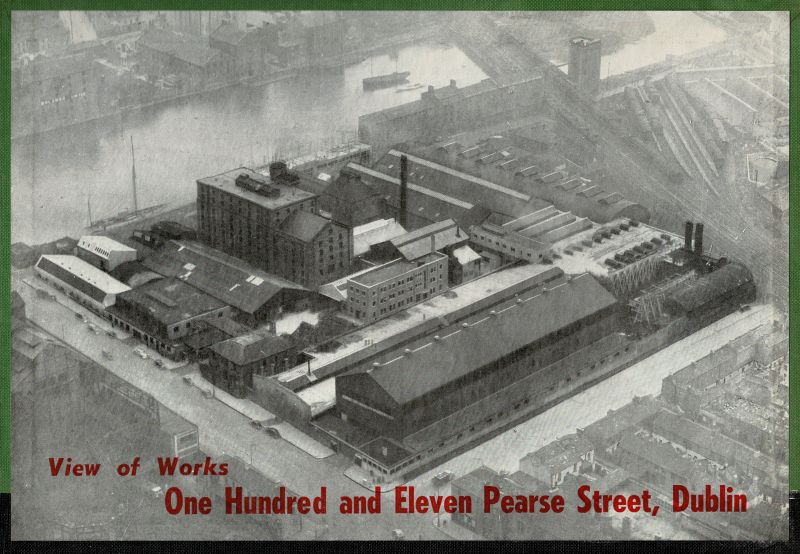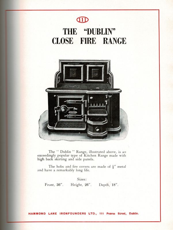 Company Catalogue of “The Hammond Lane Ironfounders Ltd. – 111 Pearse Street – Dublin” – Listing: Cast Iron Cookers – Grates – Ranges – Heating Stoves – Low Fires – C.B.Fires – R.W. & Soil Goods – Manhole Covers – Gulleys – Gratings – Ventilators – C.I.Tanks – W.C.Cisterns & General Castings. [With two Birds-Eye-View-Photographs of the Ironworks in Dublin’s Pearse Street pasted to the inner boards of the binding / Shows also a very interesting image-sheet with photographs of the Fleet of Lorries and one Service-Van which delivered the Stoves anywhere in Ireland].