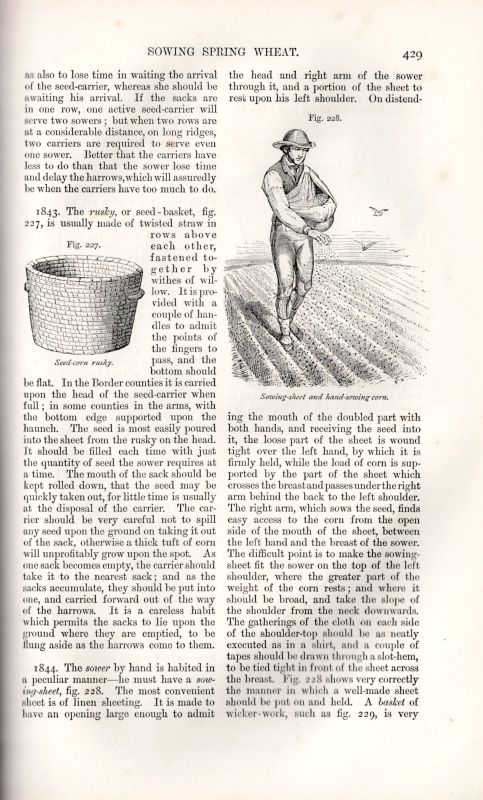 Third Edition. Two Volumes (complete set). Edinburgh / London, William Blackwood and Sons, 1871. Large Octavo (17 cm wide x 25 cm). Pagination: Volume I: Portrait-Frontispiece showing Henry Stephens, XVI, 550 pages with three Engravings in Steel and 268 Wood-Engravings within the Text / Volume II: XI, 654 pages with 14 Engravings on Steel and 288 Wood-Engravings within the Text. As an Appendix to Volume II: With 12 pages of a List of Works on Agricultural and Rural Affairs published by William Blackwood & Sons. Hardcover / Original, decorative half-leather with gilt lettering and ornament on spine and board. Binding of Volume I a bit shaky and with some damages to the spines. But the bookblock both very clean and with the stunning illustrations complete. Volume II firm and intact. This particular Third Edition is a great example of 19th century farming-history documentation. The popularity of this work is the reason why each edition improved over time. The Third Edition is the pinnacle of the publication with stunning steel-engravings and please pay attention to the particularly smart way of illustrating sowing and harvesting techniques by using black-and-white firguartive illustation of farm-hands, farmers and planters (Pitato-Planting etc.).