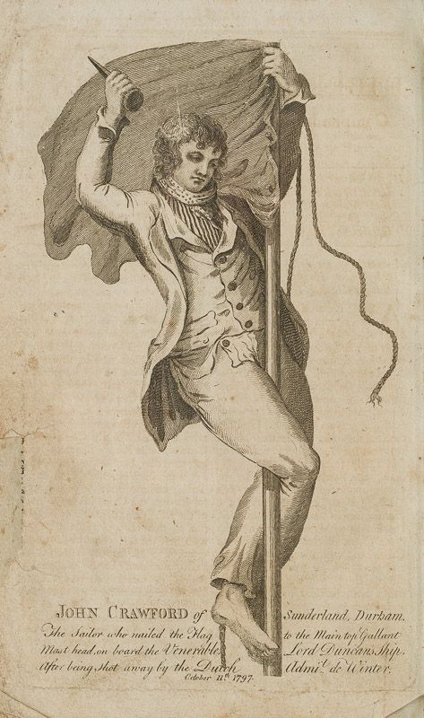 4. Engraving of “John Crawford of Sunderland, Durham. The Sailor who nailed the Flag to the Main Top Gallant Mas head on board the Venerable, Lord Duncan’s Ship, after being shot away by the Dutch Admiral de Winter, October 11th, 1797″