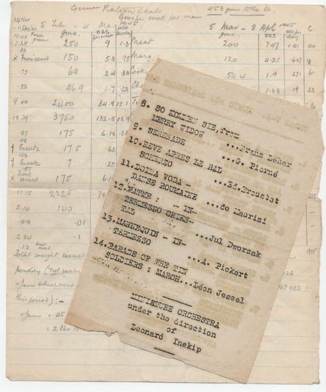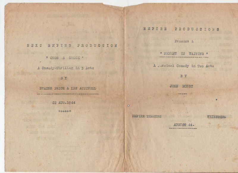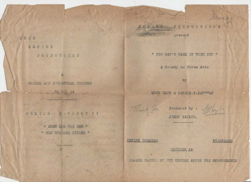 First Edition. Wellington, New Zealand, A. H. and A. W. Reed, 1945. 12 x 19cm. 180 pages with 5 illustrations. Map of Italy on pastedowns. Original Hardcover. Very good condition with only minor signs of external wear. Includes loosely inserted three programmes for Empire Theatre Productions 1944, Oflag V-A music for Christmas Day and hand written list of German rations for the Prisoners of War per week per man at OFLAG Weinsberg 1945. The programmes all signed by the cast. Very rare documents of POW (New Zealand Prisoners of War in Germany) with Plays reenacted from Playwrights Evadne Price and Ken Attiwell [sic / meaning Australian journalist and playwright Ken Attiwill] (Play called “Once a Crook” / Play by John Money – “Nephew in Waiting” / Play by Moss Hart & George S. Kaufman – “You can’t take it with you” – Produced and signed by Jimmy Taylor / Including “A Choral and Orchestral Concert on 31 Oct. 44” //