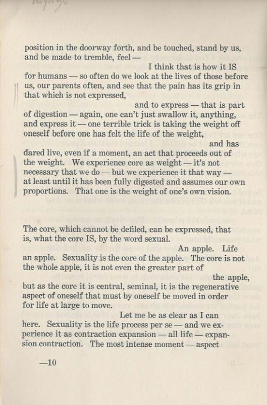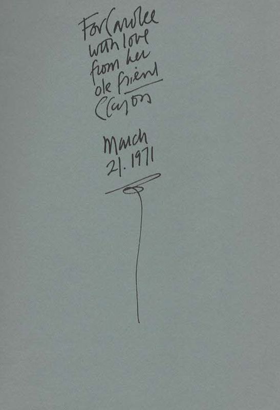 First Edition. Santa Barbara, Capricorn Press, 1971. 22.5cm x 15.3cm. 22 (6) pages. Original illustrated softcover. Excellent condition of noth editions, with only minor signs of external wear. This is one of Eshleman’s most personal works, which explains why he inscribed it in two consecutive years to Carolee Schneemann. Clayton Esleman writes about the impact Rilke’s “Letters to a Young Poet” had on him in 1959. Carolee Schneemann has marked several passages which were important to her, among which is: “for in the sense that what is deeply sick in man today is his hate for his body, in that he has loaded the most energetic word he has for love-making with all the hostility he feels against the act of love. Don’t fuck with me, we say. Keep your fucking hands off. Fuck you. And that word, like a jungle interwoven with all kinds of lianas and vines of tensions, desires, and hate, can’t now possibly convey just its erotic energy – “. / Eshleman also leaves a short biographical note (in print) at the end of this Volume in which he critically describes his consequential status quo: “…..Moved to New York City the summer of 1966…..the bottom fell out: I left my family, moved into a hole in the corner of Greenwich Avenue and Bank Street and entered Reichian Therapy…..Presently living in Sherman Oaks, California, with my wife Caryl – and, as of last week, loaned orgone accumulator sitting expectantly in Garage….– 28 January 1971”.