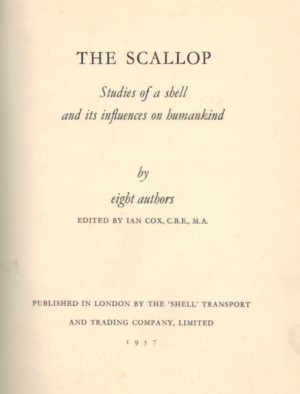 Includes for Example: Shell: A Word’s Pedigree- B. Woledge/ The Living Scallop: W.J. Rees/ A Symbol in Ancient Times: Sir Mortimer Wheeler/ The Badge of St. James: Christopher Hohler/ The Cradle of Venus: James Laver/ Escallops in Armory: The Hon. Sir George Bellew/ An Excursion into the Americas: Adrian Digby/ The Scallop at the Table: Paul Gaultier etc.