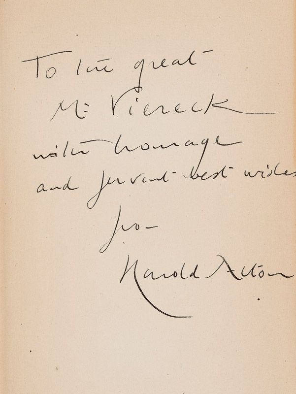 First John Lehmann Edition. London, John Lehmann Ltd., 1947. 13 cm x 19 cm. XIII, 159 pages. Original Hardcover with the rare, illustrated, original dustjacket in protective collector’s mylar. Very good condition with minor signs of external wear. The dustjacket shows some tears and fraying with minor loss to the edges. Traces of foxing on the pages and on the edges. Signed and inscribed by Harold Acton: “To the great Mr. Viereck with homage and fervent best wishes – Harold Acton”. [Second Collection of a trilogy compiled and edited by Feng Menglong in 1624].