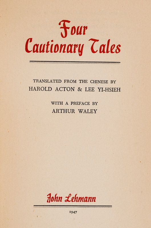 Four Cautionary Tales [Inscribed by Harold Acton to George Sylvester Vviereck]. Translated from the Chinese by Harold Acton and Lee Yi-Hsieh. With an introduction by Arthur Waley.