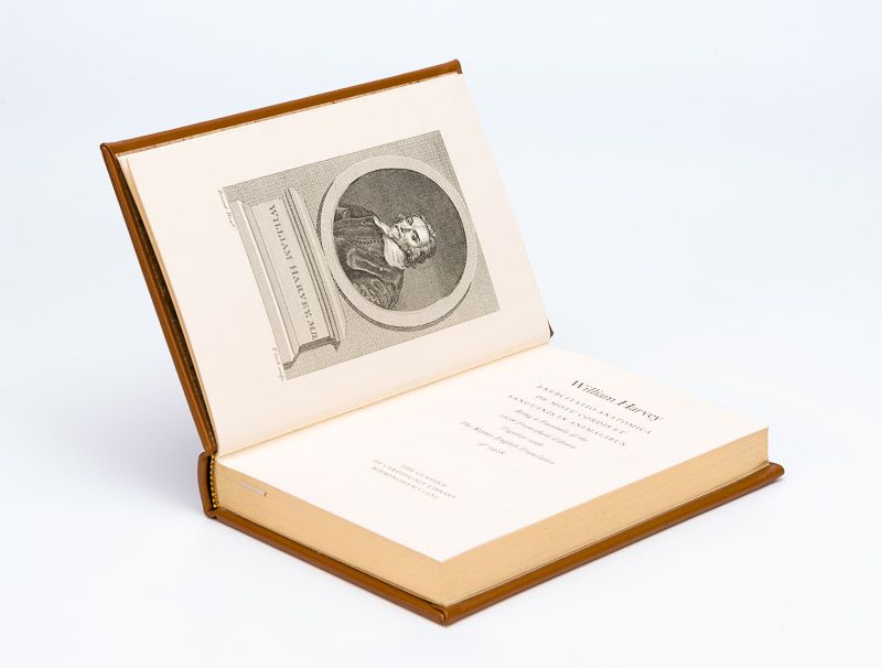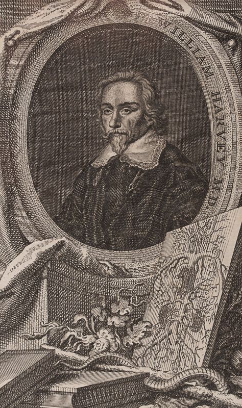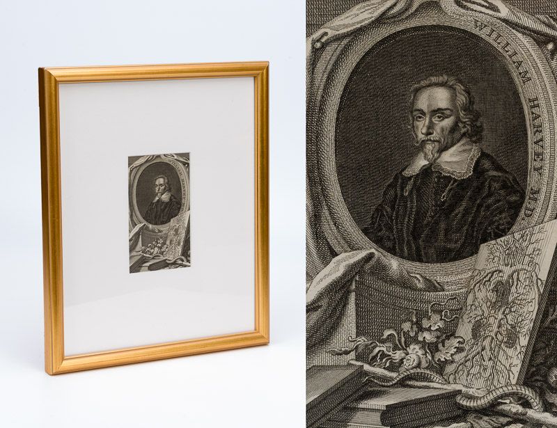 Original copper engraving portrait of english physician William Harvey, ″ first known physician to describe completely and in detail the systemic circulation and properties of blood”. The vintage engraving shows William Harvey, head-and-shoulders portrait, facing slightly left, in a medallion draped with cloth, also shows a drawing of the cardiovascular system, parts of a plant, and a snake entwined around a stick, suggesting a caduceus. [The original engraving is framed and comes with an exceptional Facsimile of the first edition of “De Motu Cordis (see images)”]. [Amsterdam], J. Houbraken, no year [c.1770]. Beautifully Framed. Size of frame with Harvey’s portrait: 32 cm x 38 cm. Size of the actual portrait engraving: 9.5 cm x 15.5 cm. Excellent condition !