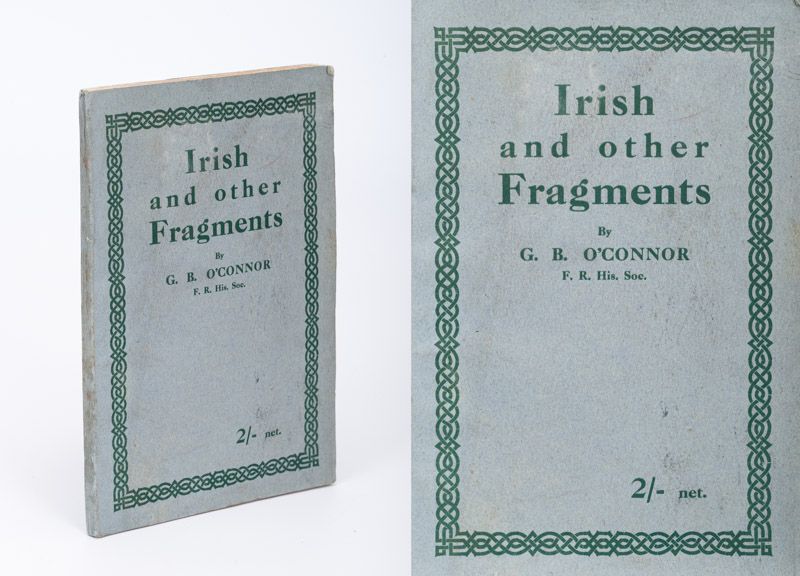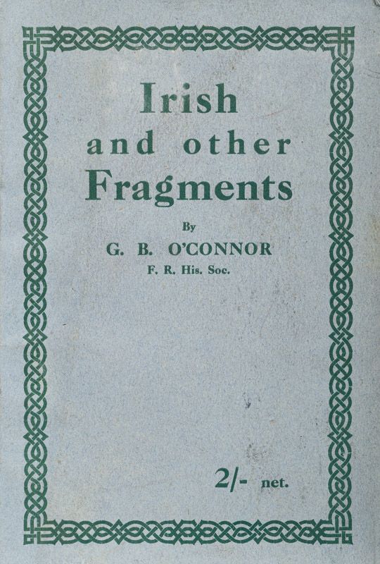 From the Preface by G.B. O’Connor: “My object in publishing these “Fragments” is to try and combine a certain amount of little used information with some amusement and racial satisfaction. At the same time I wish to prove to my country-people that the Gaelic part of our national inheritance owes something to the racial admixtures which our country has seen. That, in fact, not only the Gaelic and old Irish but the new Irish elements are represented in the national mentality and characteristics; and that apart from whatever now be said to be working towards that end, we are a nation and a strongly marked one.”