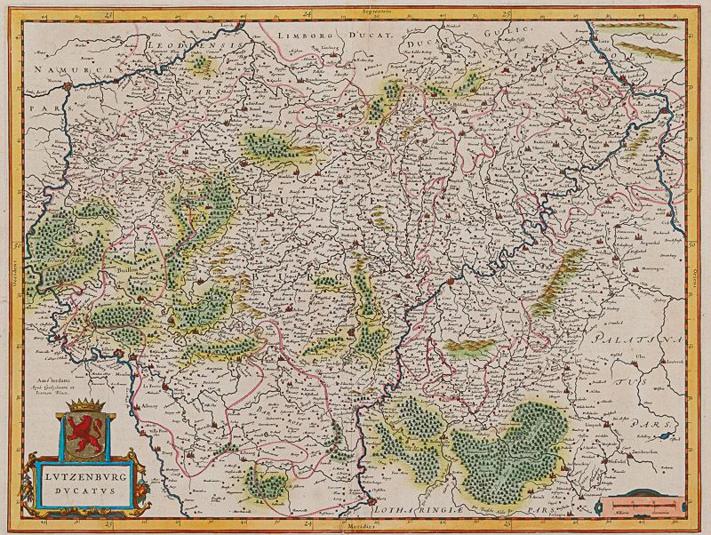 Large and interesting map of the historical Duchy of Luxembourg. Richly detailed, with relief shown pictorially. The region is dominated by the Meuse, Moselle and the River Rhine to the north. The value of the highly-contested ground is evident given the fortified towns marked on the map: Namen, Metz and Sedan: control of this region would change hands many times over the centuries as frontiers moved back and forth across maps. The map is crowded with the names of cities such as Trier, Luxemburg, Saarbrucken and Coblentz – evidence of the urban nature of the heavily populated and rich region. The vast forests such as the Ardennes are also marked on the map. Areas making up modern-day Rhineland-Palatinate (Germany), Saarland (Germany), and Lorraine (France) can be seen on the map also.