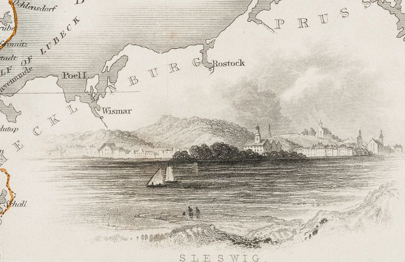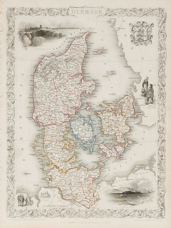 The most important project John Tallis undertook, was the ‘Illustrated Atlas’ from 1851. The original map we offer here, was part of this exceptional Atlas and all the maps it contained are still today considered as the last reminder of an era of lavish map production. Tallis worked the project together with John Rapkin (1815-1876) and it was Rapkin’s style and talent that we have to thank for when we marvel at these maps today. What makes these maps so special is the detail of engraved vignettes that surround the map and often show indigenous scenes, people in their environment and even more so, historical buildings or historical views of towns and cities, architecture and landscape.