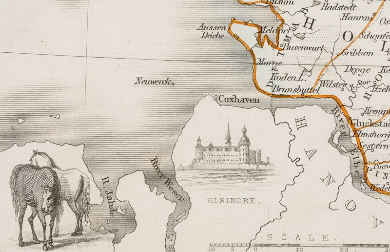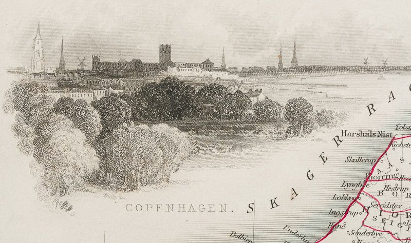 Beautiful and interesting map of Denmark: the Jutland Peninsula and the surrounding islands such as Zealand and Funen in the Baltic and the North Sea. The political subdivisions of Denmark are delineated and the towns and cities, including Copenhagen, Aarhus, and Odense are shown. Off the east coast the Cattegat strait is identified. The southern coast of Sweden is shown as are the German coasts in the lower part of the map (Hanover, Mecklenburg and Prussia)