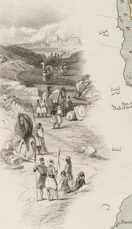 The most important project John Tallis undertook, was the ‘Illustrated Atlas’ from 1851. The original map we offer here, was part of this exceptional Atlas and all the maps it contained are still today considered as the last reminder of an era of lavish map production. Tallis worked the project together with John Rapkin (1815-1876) and it was Rapkin’s style and talent that we have to thank for when we marvel at these maps today. What makes these maps so special is the detail of engraved vignettes that surround the map and often show indigenous scenes, people in their environment and even more so, historical buildings or historical views of towns and cities, architecture and landscape.