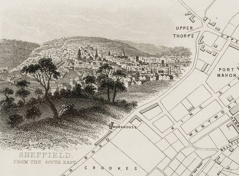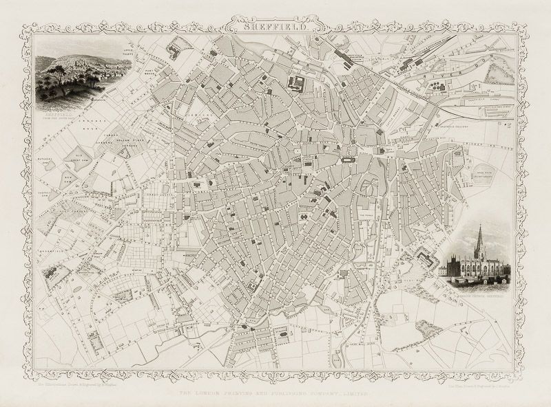 Handsome town-plan of Sheffield in South Yorkshire, England. The River Don can be seen running through the city near the top of the map. Railway, street and district areas of the city are also included. Decorative scrolling and title cartouche around the edges of the map.