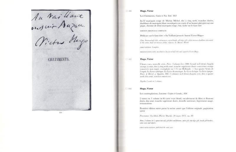 H.Bradley Martin was a great lover of all the literature of the Romantic period (Lamartine, Chenier, Chateaubriand), but he was also attracted by the revival of the novel at the hands of Balzac, Flaubert, Stendhal and Merimee. The poetry of the nineteenth century, that of Hugo, Baudelaire, Verlaine for example, naturally finds a place here. The collection moves into the twentieth century with Marcel Proust. A feature of the library is its collections of works by particular authors, such as Balzac, Sand and Hugo, which are among the most important ever made. For Balzac, the references to Pierre Duche or Gabalda are of lasting value. The two rare copies of Le Pere Goriot and La Peau de Chagrin derive from the library of Dr. Nacquart, Balzac’s personal physician, and the library also includes his earliest works, published under the pseudonyms of Saint-Aubin and Lord R’Hoone, as well as numerous forgeries and first editions, generally in original paper wrappers. (From introduction)