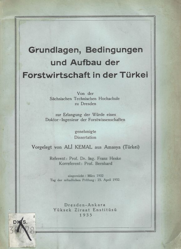 Dresden/Ankara, Yüksek Ziraat Enstitüsü, 1935. Gr.-8°. VII, 142 Seiten. 1 gefaltete Waldkarte der Türkei. Softcover / Broschur. Ehemaliges Bibliotheksexemplar. Titelblatt zur Hälfte abgerissen. KEINE Anstreichungen.