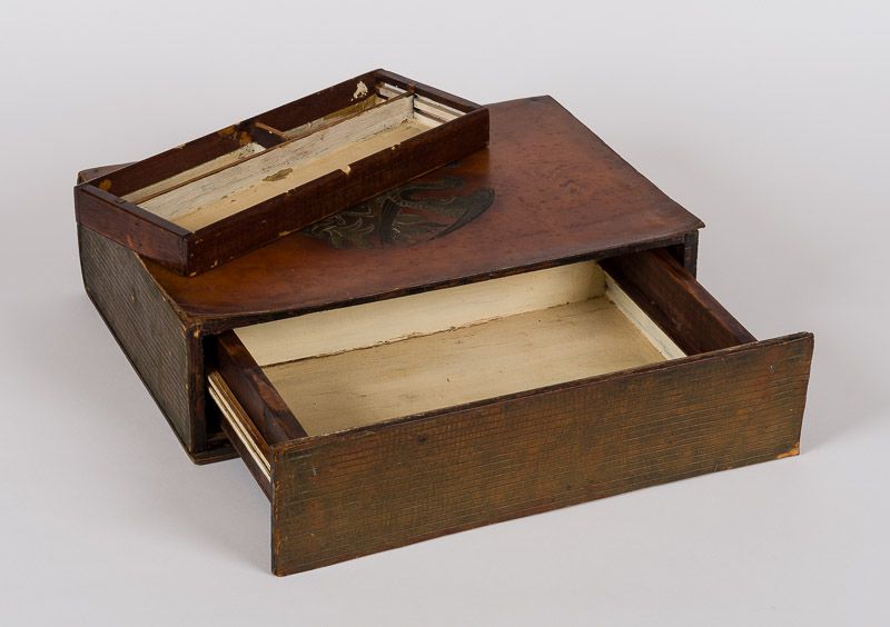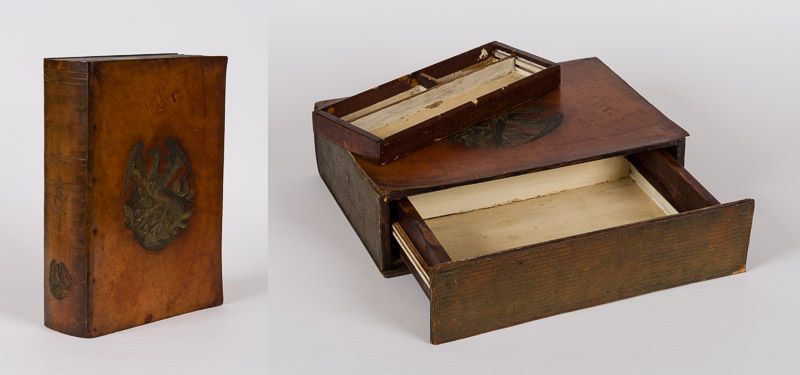 St.Mawr – Mockup – This is not the book but a unique Furniture Drawer (Toolbox) made by a D.H.Lawrence enthusiast. The Drawer was made in bookform and has the St.Mawr Emblemata on the cover and the title on the spine. Excellent craftsmanship. Leather covered board.