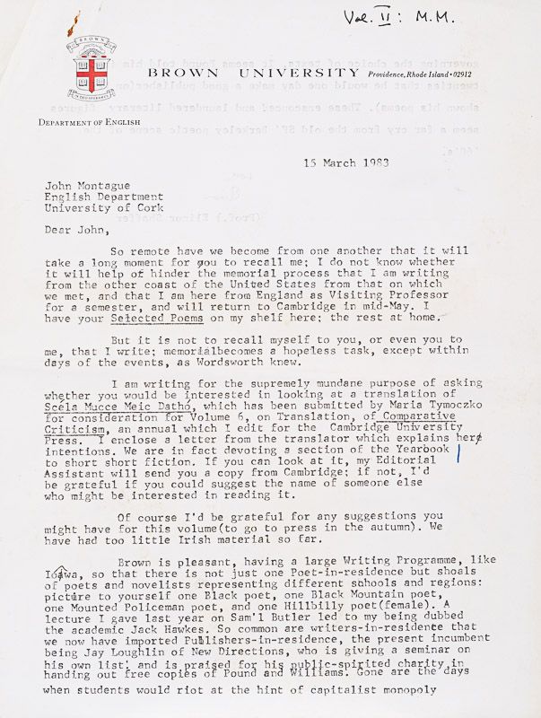 France / Ireland, Carros / Cork, 1980-1983. A4. 4 pages on two sheets (main Montague-letter), 2 pages on 1 sheet (Le Brocquy – answer), 1 postcard, 1 manuscript-letter from Jacques Dupin to John Montague (25.10.1978) about a translation of “L’Éboulement” (Dupin also speaks about Louis le Brocquy in the letter), several pages of letters (mostly typed and signed) from other figures in irish and international literature and art, collection of vintage photos of honorary doctorate degree-Montague at UCC Cork. Original Envelopes. Very good condition with only minor signs of external wear. Besides some ephemeral materials from personalities in Literature and Art, addressed to John Montague, the small collection includes several vintage photographs of John Montague, taken during his acceptance of a honorary Doctorate of Literature at UCC, Cork, as well as a Legislative Resolution by the State of New York (Senator Daly), recognizing and thanking the distinguished author and poet John Montague with this decree on May 26, 1987. Among the lesser interesting materials is a pamphlet titled “Ireland’s Literary Renaissance – 20th century Portraits” in which portraits by Louis Le Brocquy of John Montague and Thomas Kinsella are included. The pamphlet is accompanied by a letter from James White to John Montague in which he explains this being a publication that was released for an exhibition in Chicago and he apologises for the entries being “necessarily short but hopefully reasonably correct”. Provenance: From the private collection of John Montague’s papers in his recently sold West Cork Home.