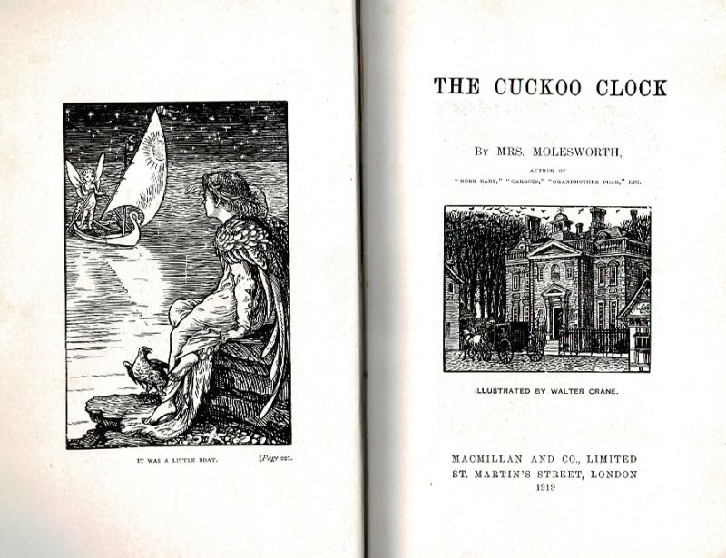 The Cuckoo Clock is a British children’s fantasy novel by Mary Louisa Molesworth, published in 1877 by Macmillan. It was originally published under the pen name Ennis Graham and reissued in 1882 as by Mrs. Molesworth, the name by which she is widely known. Both of those editions and many later ones were illustrated by Walter Crane; an 1893 uniform edition is available online at the University of Pennsylvania. An edition illustrated by Maria L. Kirk was published in 1914; it is available online at HathiTrust Digital Library. (Wikipedia)