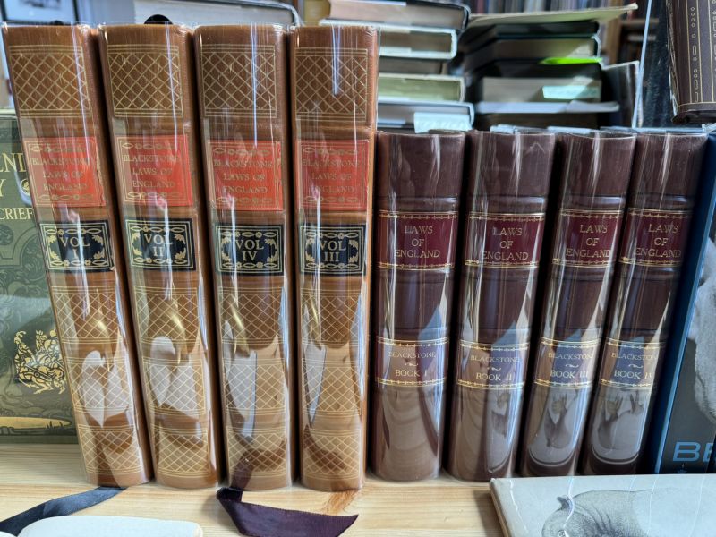 The Rare Edward Christian Edition. Four Volumes (complete set). London, A. Strahan and W. Woodfall, Law-Printers to the King’s most excellent Majesty, for T. Cadell, in the Strand, 1793,1794,1795. Octavo. Pagination: Volume I: X, [6], III, [1], 487 pages / Volume II: [8], 520, XX pages / Volume III: Frontispiece-Portrait, [8], 455, XXXV, [1], 16 pages with three more portraits bound-in / Volume IV: [8], 443, VIII, [72] pages. With four Portraits in total and one large folding table showing the “Table of Descents”. The Portraits which are bound into Volume III of the set are: I. Portrait of British Judge “William Murray, 1st Earl of Mansfield” / II. Portrait of “Lord Chief Baron Gilbert” [Sir Jeffrey Gilbert, Lord Chief Baron of the Exchequer in both Ireland and England] / III. Portrait of english Judge and Member of Parliament, Sir John Comyns, Knt. / IV. Portrait of english lawyer and Lord High Chancellor Philip Earl of Hardwicke. Hardcover / Original edition of the 18th century, rebacked by a master-binder with 20th century leather-spines in the style of the 18th century. This extremely rare edition Edward Christian – Edition of Blackstone, with the last corrections before Blackstone’s death, published for the first time by Edward Christian in the years 1793-1795. This set is used with some minor spotting to pages but overall a very desirable and important version of Blackstone’s commentaries on the Laws of England. [The set comes also with a stunning Limited Edition of the four-volume- Reprint of the First Edition of Blackstone’s Commentaries (1766)].
