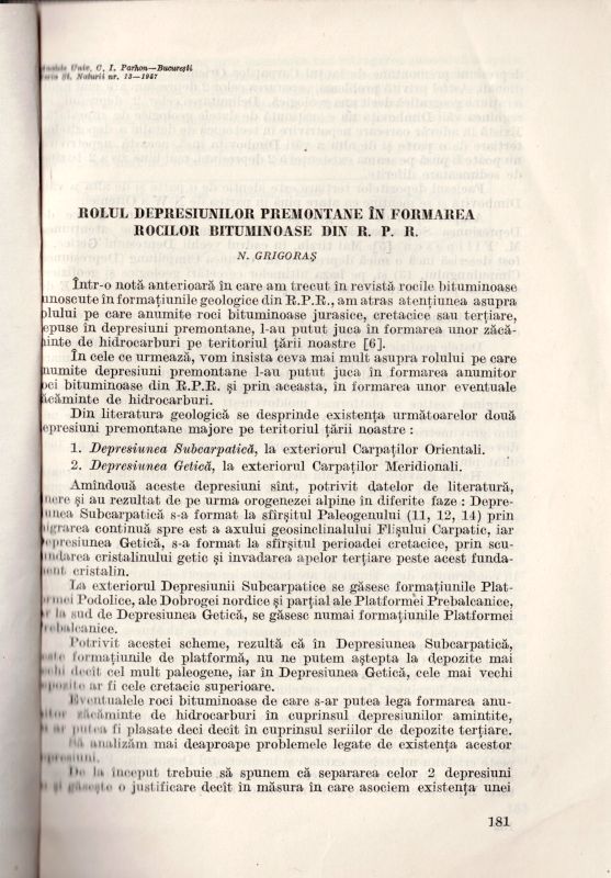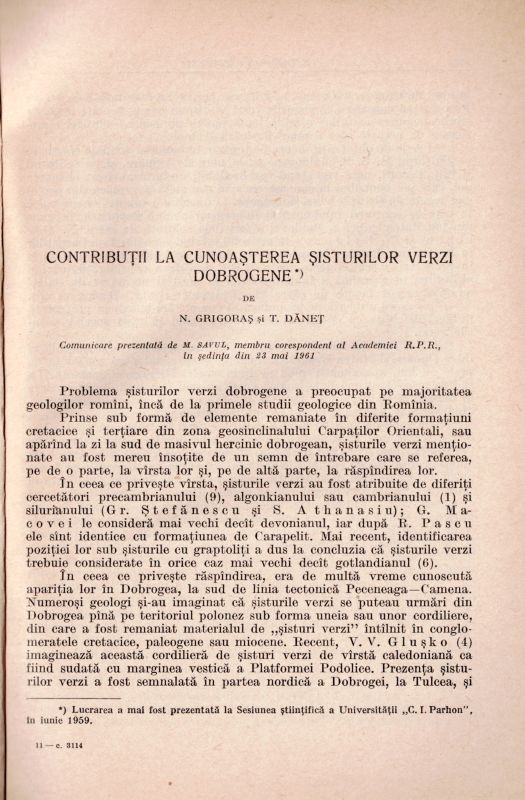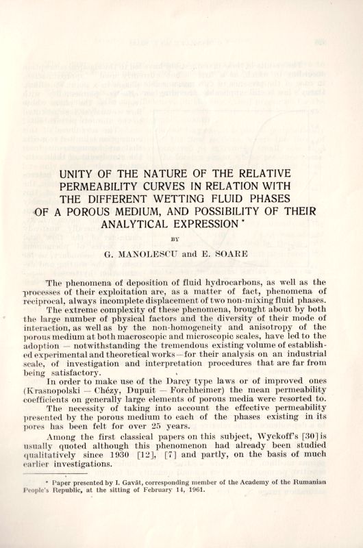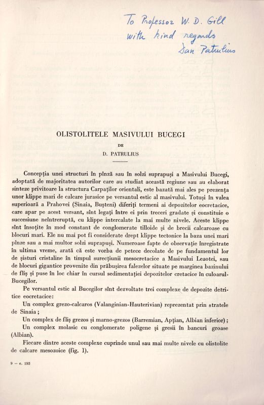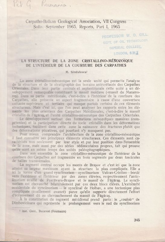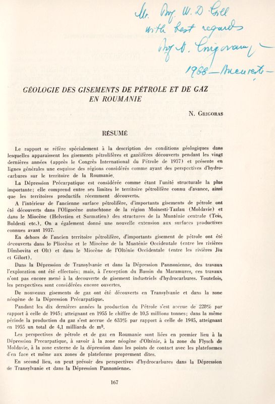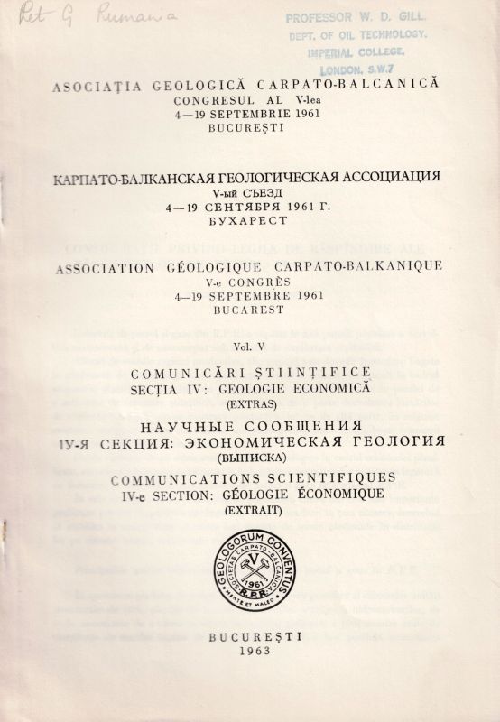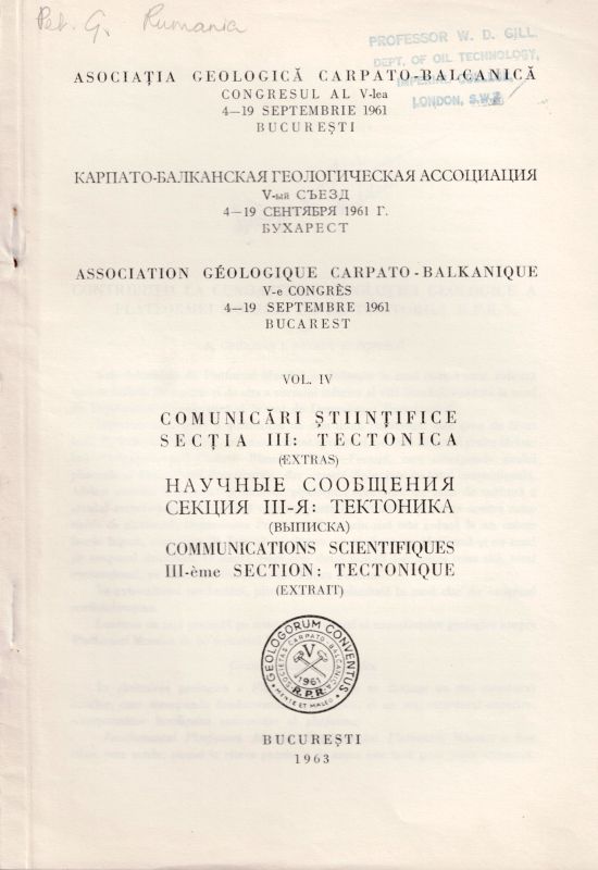 Collection of sixteen (16) important publications on the Geology of Romania and the Carpathian Region from the William Daniel Gill Collection. The collection includes the following publications (all first editions): 1. N. Grigoras and N. Constantinescu – “Geological Activity for Oil and Gas in the Socialist Republic of Rumania” (1969) / 2. N. Grigoras and I. Patrut and M.Popescu – Contributi La Cunoasterea Evolutiei Geologice A Platformei Moesice De Pe Teritoriul R.P.R. (1961) / 3. N. Grigoras – “Rolul Depresiunilor Premontane In Formarea Rocilor Bitumoase Din R.P.R.” (1957) / 4. N.Grigoras – “Consideratii Privind Legile De Raspindire Ale Zacamintelor De Petrol Si Gaze Din R.P.R” (1961) / 5. N.Grigoras and S.Pauliuc and I. Costea – “Date Noi Privind Faciesurile Paleogenului Dintre Vaile Oituz Si Bistrita” (1966) / 6. N.Grigoras and S.Pauliuc and I.Costea – “Noi Contributii Privind Depozitele Paleogene Dintre Vaile Zabala Si Oituz” (1964) / 7. N.Grigoras and S.Pauliuc and I. Costea – “Date Noi Privind Depozitele Paleogene Dintre Valea Putnei Si Valea Buzaului” (1963) / 8. N.Grigoras and T. Danet – “Contributi La Cunoasterea Sisturilor Verzi Dobrogene” (1961) / 9. N.Grigoras – “Contributiuni La Cunoasterea Geologie Reg.Craiova – Caracal”(1961) / 10. N.Grigoras – “Geologie des Cisements de Petrole et de Gaz en Roumanie” (1966) – Inscribed and signed by N.Grigoras / 11. Ekim Boncev – “Probleme der Lineamenttekonik im oestlichen Teil der Balkanhalbinsel” (1965) / 12. G.Manolescu and E.Soare – “Unity of the Nature of the Relative Permeability Curves in Relation with The Different Wetting Fluid Phases of a Porous Medium and Possibility of their Analytical Expression” (1962) / 13. D.Patrulius – “Olistolitele Masivului Bucegi” (1963) – Inscribed and signed by Dan Patrulius to William Daniel Gill / 14. Mircea Sandulescu – “Stratigrafia Si Tectonica Molasei Micocene Din Regiunea Valea Mare – Berzunt – Onesti”(1959) / 15. M.Sandulescu – “La Structure de la Zone Cristallino-Mesozoique de L’Interieur de la Courbure des Carpathes” (1965) / 16. Geological Map of Poland – “Harta Geologica” Scara 1:200.000 – No.36. “Ploiesti” Nota explicativa de: M. Sandulescu et. al. (1968) /