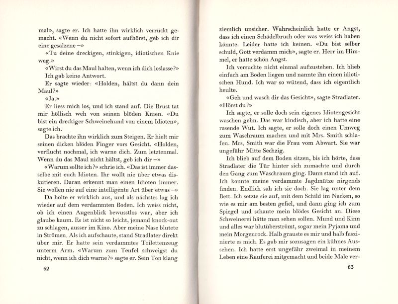 Erste deutsche Auflage. [First German Edition of “The Catcher in the Rye”]. Zürich, Diana Verlag, 1954. 14 x 21 cm. 290 Seiten. Original Hardcover with original dustjacket in protective collector’s mylar. Absolut “Sehr guter Zustand” mit nahezu tadellos erhaltenem Schutzumschlag (in Mylar) mit nur ganz wenigen Gebrauchsspuren. Der Band selbst in exzellenter Erhaltung mit nur einigen Stockfleckchen auf dem oberen Schnitt. Innen sehr sauber. In dieser Erhaltung ein nahezu unauffindbares Sammler-Exemplar dieses seltenen Buchs !
