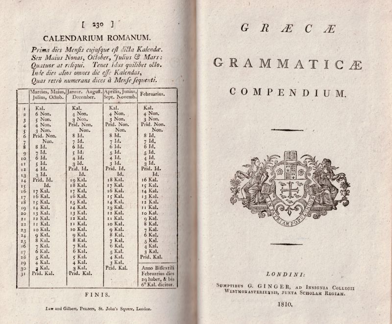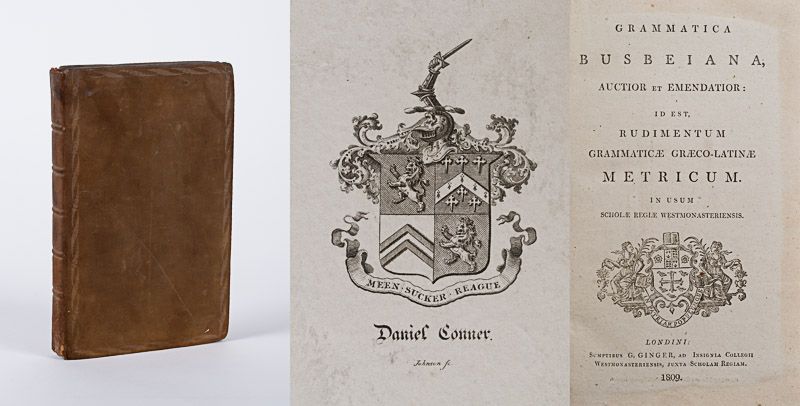 London, G.Ginger, 1809. Octavo. 230 pages with Calendarium Romanum / [Bound with: “Graecae Grammaticae Compendium” – London, G.Ginger, 1810. 40 pages]. Hardcover / Fantastic, original full suede-leather binding with ornament on boards. Very good condition with only minor signs of wear. From the library of Daniel Conner (Connerville / Manch House), with his Exlibris / Bookplate to pastedown.