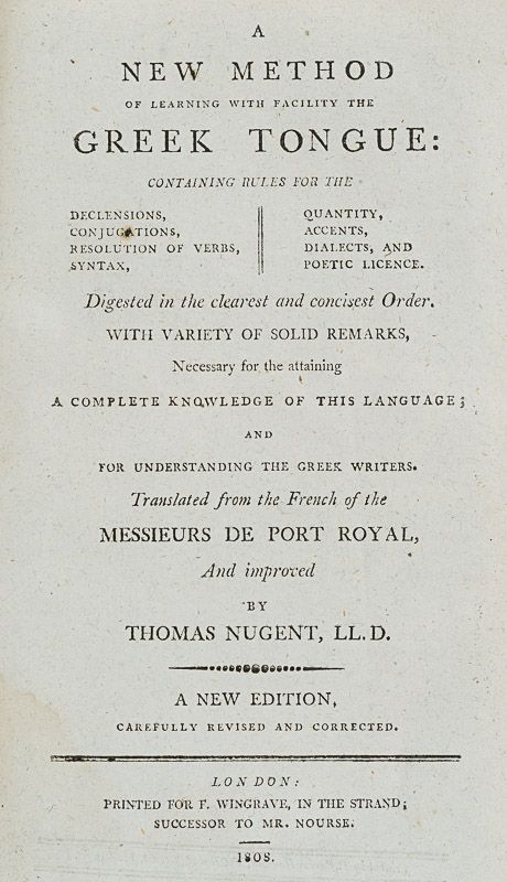 A New Method of learning with facility the Greek Tongue : Containing Rules for the Declensions, Conjunctions, Resolution of Verbs, Syntax, Quantity, Accents, Dialects, And Poetic Licence. Digested in the clearest and concisest order. With Variety of solid remarks, necessary for the attaining A complete knowledge of this language; And for understanding the Greek writers. Translated from the French of the Messieurs de Port-Royal, And improved by Thomas Nugent, LL.D.