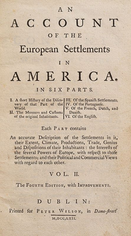 Account of the European Settlements in America – In Six Parts [Published in Two Volumes of which we offer here Volume II pf the rare Irish Edition only and which includes the “Description of Canada” and “Cape Breton”, The West-Indies, Nova Scotia, Several Southern States etc.]. The Six Parts are: I. A short History of the Discovery of that Part of the World / II. The Manners and Customs of the original Inhabitants. / III. Of the Spanish Settlements. / IV. Of the Portuguese. / V. Of the French, Dutch, and Danish. / VI. Of the English. / Each Part contains: An Accurate Description of the Settlements in it, their Extent, Climate, Productions, Trade, Genius and Dispositions of their Inhabitants : the Interests of the several Powers of Europe, with respect to those Settlements and their Political Commercial Views with regard to each other.