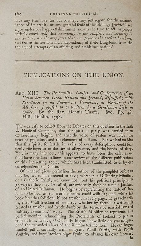The periodical promoted conspiracy theories of attempts to establish Jacobinism in Britain, accusing the Monthly Review, the Analytical Review and The Critical Review of spreading Jacobinism through “secret channels, disguised in various ways.” It supported the passage of the Unlawful Societies Act 1799 and the Combination Act 1799, arguing that the state needed the “wisdom to repress” in order to effectively defeat “domestic traitors.” It also opposed the Irish Rebellion of 1798. (Wikipedia)