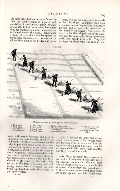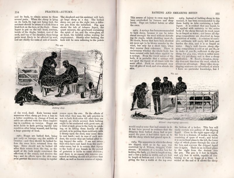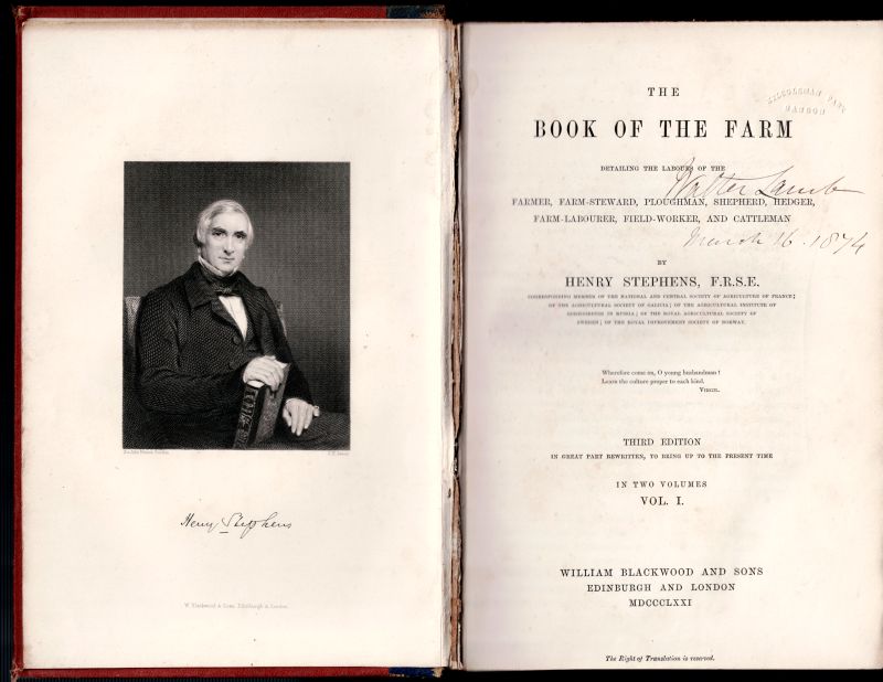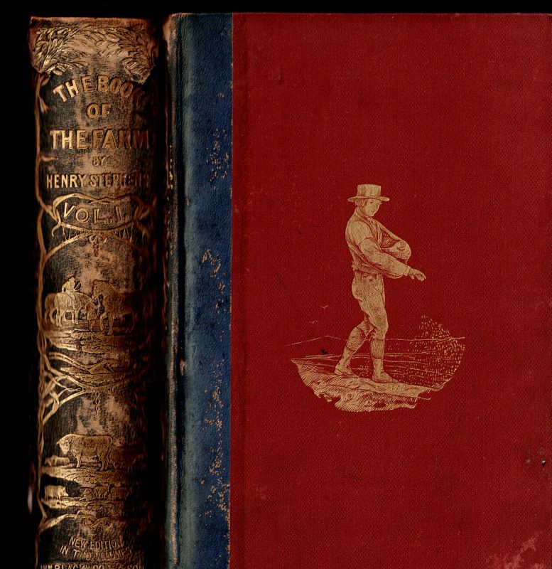 Third Edition. Two Volumes (complete set). Edinburgh / London, William Blackwood and Sons, 1871. Large Octavo (17 cm wide x 25 cm). Pagination: Volume I: Portrait-Frontispiece showing Henry Stephens, XVI, 550 pages with three Engravings in Steel and 268 Wood-Engravings within the Text / Volume II: XI, 654 pages with 14 Engravings on Steel and 288 Wood-Engravings within the Text. As an Appendix to Volume II: With 12 pages of a List of Works on Agricultural and Rural Affairs published by William Blackwood & Sons. Hardcover / Original, decorative half-leather with gilt lettering and ornament on spine and board. Binding of Volume I a bit shaky and with some damages to the spines. But the bookblock both very clean and with the stunning illustrations complete. Volume II firm and intact. This particular Third Edition is a great example of 19th century farming-history documentation. The popularity of this work is the reason why each edition improved over time. The Third Edition is the pinnacle of the publication with stunning steel-engravings and please pay attention to the particularly smart way of illustrating sowing and harvesting techniques by using black-and-white firguartive illustation of farm-hands, farmers and planters (Pitato-Planting etc.).