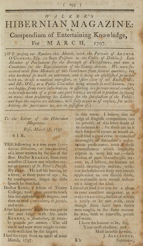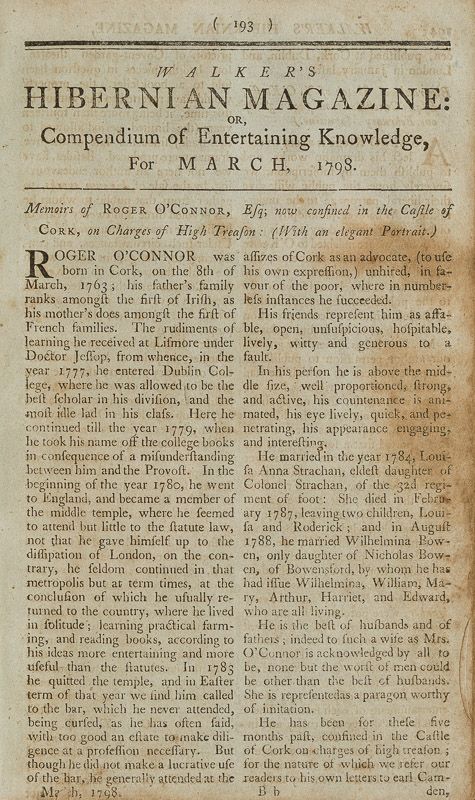 In London, with his brother Roger, O’Connor had moved in the same radical circles as the United Irish agent Jane Greg. Greg—possibly in the company of O’Connor—returned to Belfast where she was reported to the authorities as being “very active at the head of the Female [United Irish] Societies” in the town. O’Connor himself made a political appeal to women.