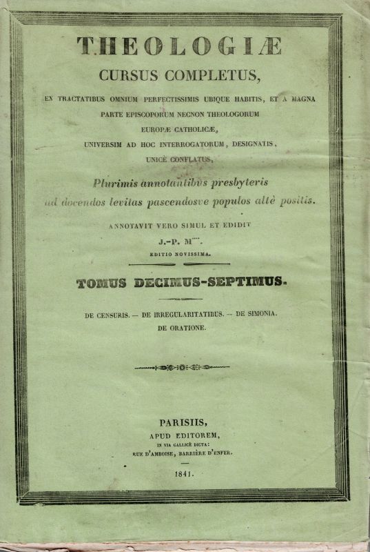 Theologiae Cursus Completus – Tomus Decimus-Septimus – Includes: “De Censuris” – “De Irregularitatibus” – “De Simonia” – “De Oratione”.
