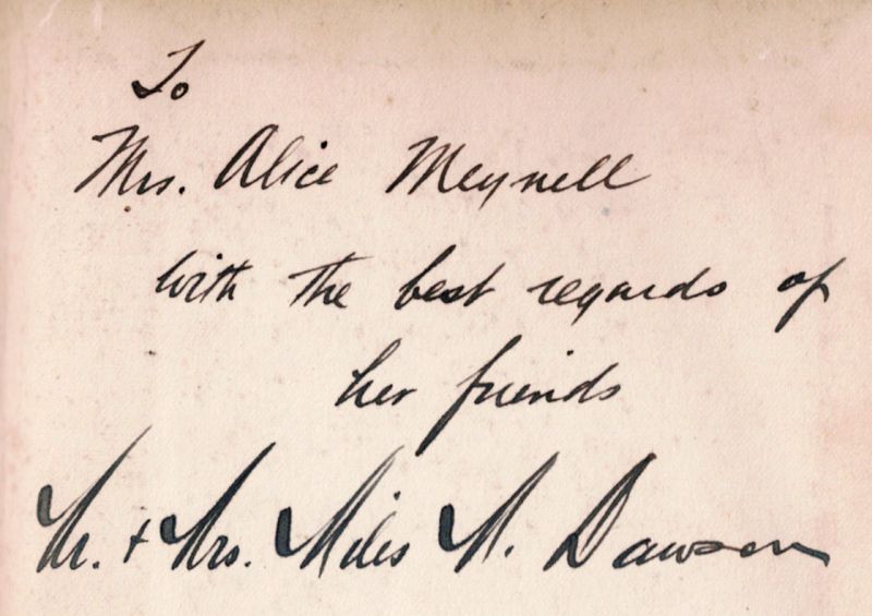 To Mrs. Alice Meynell with the best regards of her friends Mr. + Mrs. Miles M. Dawson