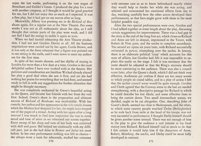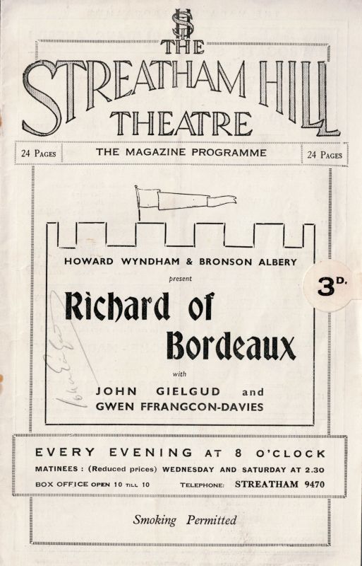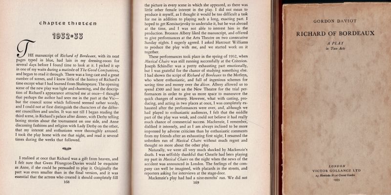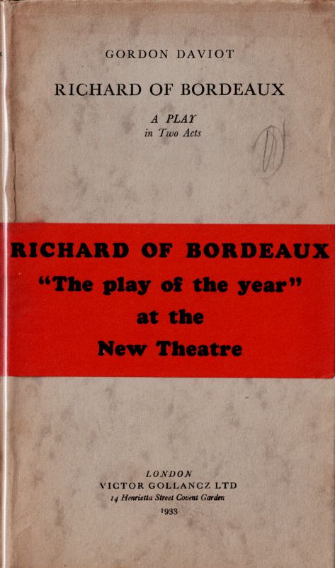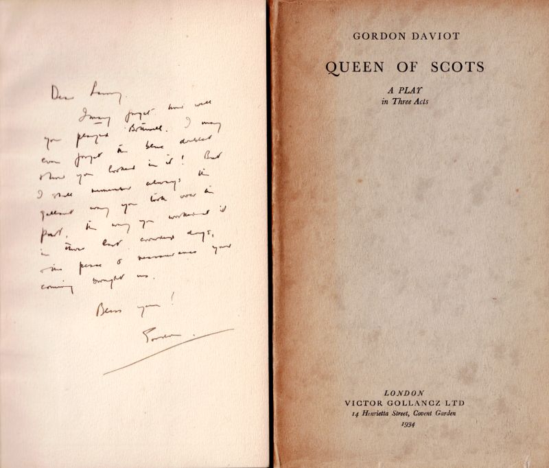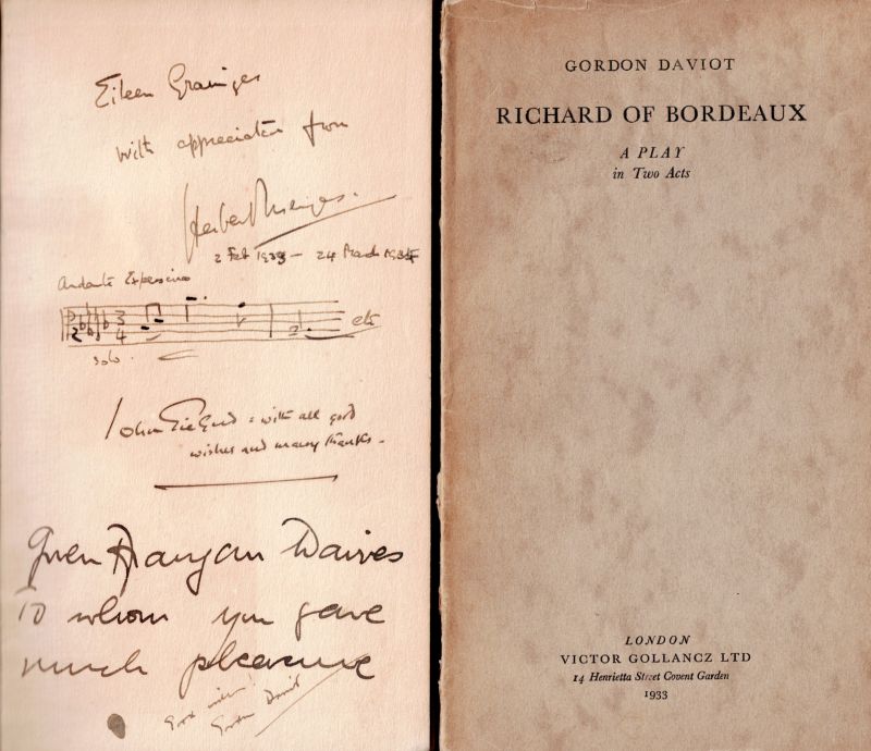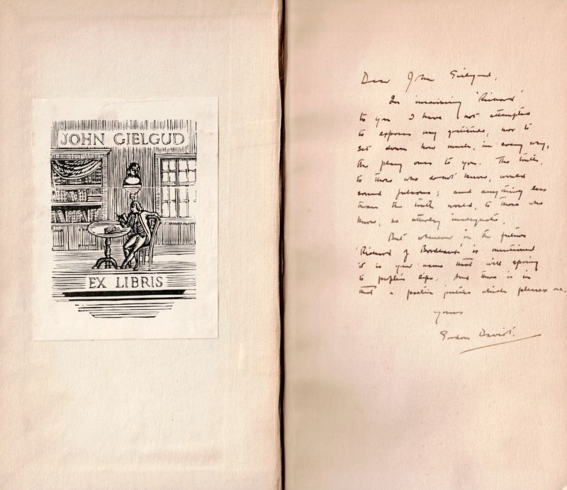 Josephine Tey – John Gielgud Collection of stunning Association copies of Plays which crucially defined both of their careers as writers and actors. The collection includes important, signed and inscribed association – copies of the two significant productions “Richard of Bordeaux” and “Queen of Scots”, both from John Gielgud’s personal library and with manuscript inscriptions to John Gielgud [and Laurence [Larry] Olivier] by Josephine Tey, aka Gordon Daviot, aka Elizabeth MacKintosh. The collection includes: 1. Gordon Daviot [Josephine Tey] – “Richard of Bordeaux – A Play in Two Acts” – With John Gielgud’s Bookplate (Ex Libris). The ultimate Association-copy, warmly and lengthy inscribed by Josephine Tey to John Gielgud. First Edition. London, Victor Gollancz, 1933 / 2. “Richard of Bordeaux” – Original Programme of “The Streatham Hill Theatre”, 1934. Signed by John Gielgud / 3. Gordon Daviot [Josephine Tey] – “Richard of Bordeaux” – Original File-copy with dustjacket and Publisher’s wrapper “The Play of the Year” at the New Theatre” – First Edition, 1933 / 4. Gordon Daviot [Josephine Tey] Gordon Daviot – “Richard of Bordeaux – A Play in Two Acts” – [Fifth Edition, 1933] – Special Cast, Producer and Production-Signed copy and inscribed to one “Eileen Grainger”, with the most interesting dedications in manuscript signatures – Signed and inscribed by lead actor and producer John Gielgud [Richard II], Signed and inscribed by leading Lady, actress Gwen Ffrangcon-Davies, Signed and inscribed by Gordon Daviot [Josephine Tey], Also beautifully signed and inscribed with a musical score by Shakespeare-composer and Musical Director for John Gielgud, Herbert Menges OBE ! / 5. “Queen of Scots – A Play in Three Acts” – The Ultimate Association-copy, inscribed by Josephine Tey to her producer: “John Gielgud – from ‘his Gordon Daviot’ / July 1934” / 6. Gordon Daviot – “Queen of Scots – A Play in Three Acts” – Association-copy, signed and warmly and lengthy inscribed by Josephine Tey to Laurence Olivier / 7. Gordon Daviot [Josephine Tey] – “Richard of Bordeaux” – A Softcover-Version of the Play in Fourth Impression, 1933 / 8. Josephine Tey – “The Daughter of Time” – First Edition, Second Impression (Second Printing). London, Peter Davies, July 1951 [The First Edition was in June 1951]. Original Hardcover with the slightly frayed original dustjacket in Mylar / 9. John Gielgud – “Early Stages” – New and Revised Edition. London, The Falcon Press, 1948. With pages of detail about the work of John Gielgud with Gordon Daviot [Josephine Tey] / 10. Jennifer Morag Henderson – “Josephine Tey – A Life” – With a Foreword by Val McDermid. Sandstone Press, 2015 //
