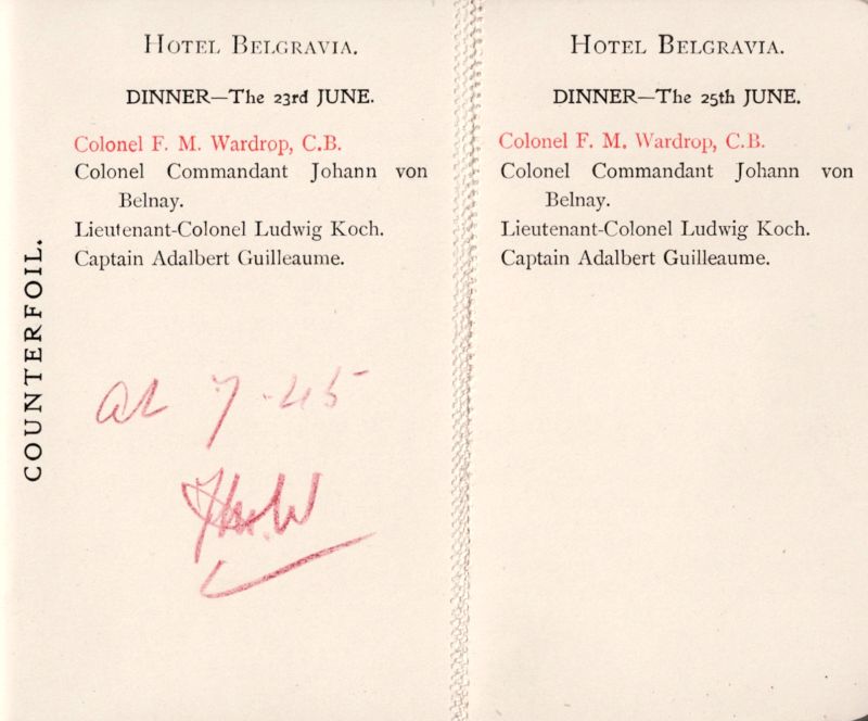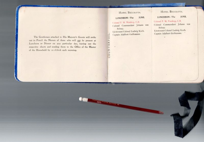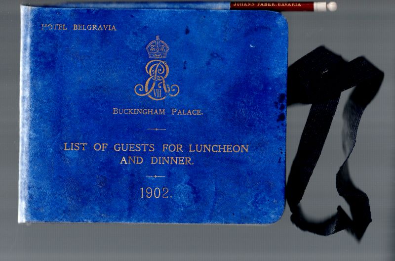 Original Luncheon-Invitation-Ticket-List, published in Book-Form with original Ivory-Head-Pencil by Johann Faber (Bavaria), attached on the occasion of King Edward VII’s Coronation Dinner at : “Hotel Belgravia / Buckingham Palace” – Original Ticket-Book: “List of Guests for Luncheon and Dinner – 1902 for King Edward VII’s Guests Colonel F.M.Wardrop, C.B., Colonel Commandant Johann von Belnay, Lieutenant-Colonel Ludwig Koch and Captain Adalbert Guilleaume”.
