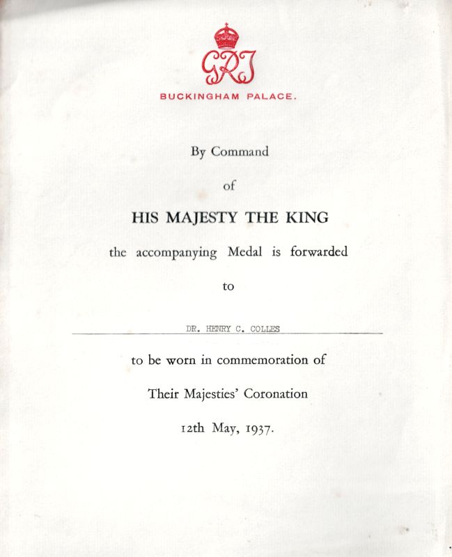 Original Certificate with beautiful Letterhead of Buckingham Palace (″GRJ”) for a Medal awarded by King George VI to english music critic Henry Cope Colles “to be worn in commemoration of Their Majesties’ Coronation 12th May, 1937”.