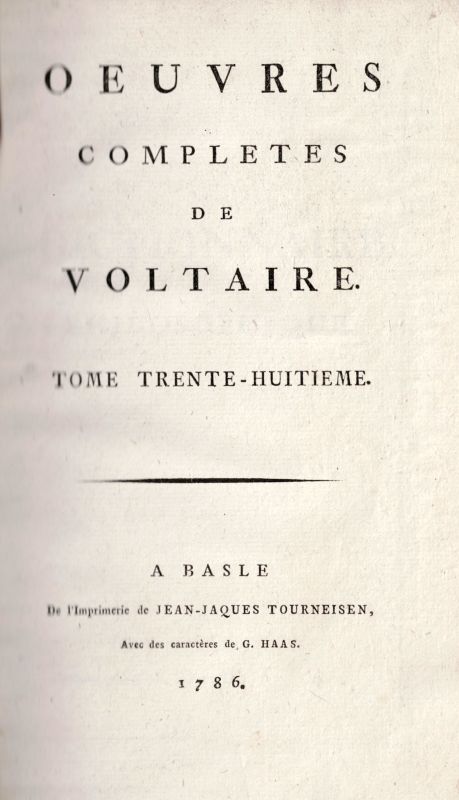 Basel, [De l’imprimerie de Jean-Jacques Tourneisen], 1786. 20.9cm x 12.6cm. 552 pages. Original Hardcover. Good condition only, with considerable rubbing to the binding. Preowner’s name plate on pastedown. Bookplate of Richard Oliver (Presented to the Albemarle Club). [Oeuvres Completes de Voltaire. Tome Trente-Huitieme].