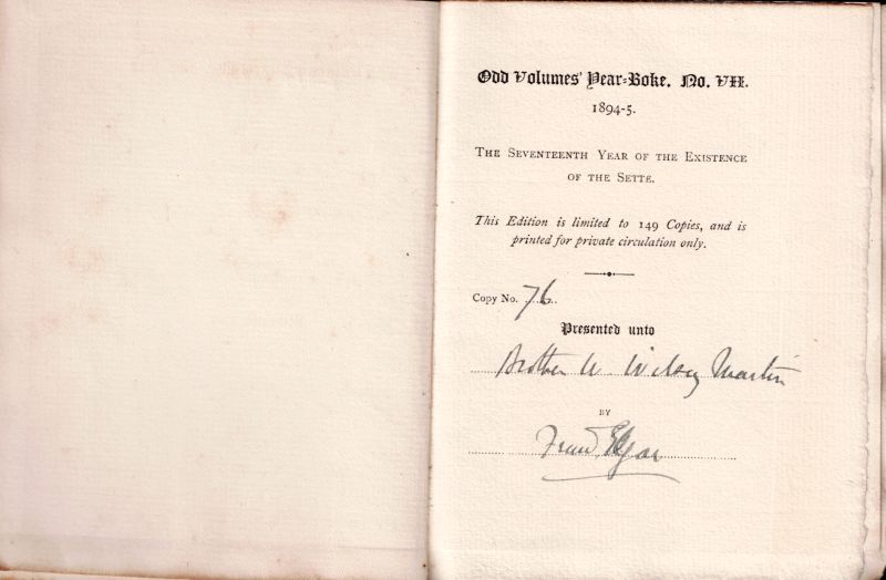 The Year Boke of Odd Volumes. An annual record of the transactions of the Sette : seventeenth year, 1894-95. Compiled mainly from the Minute Book of the Sette, and imprynted for private circulation only. President Brother Francis Elgar LLD FRS.
