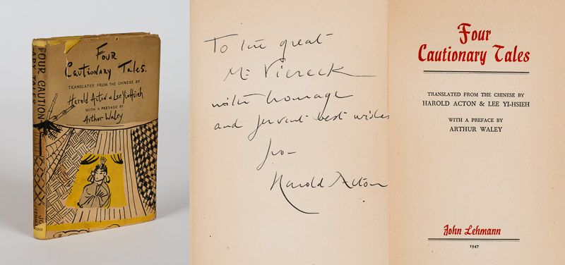 Four Cautionary Tales [Inscribed by Harold Acton to George Sylvester Vviereck]. Translated from the Chinese by Harold Acton and Lee Yi-Hsieh. With an introduction by Arthur Waley.