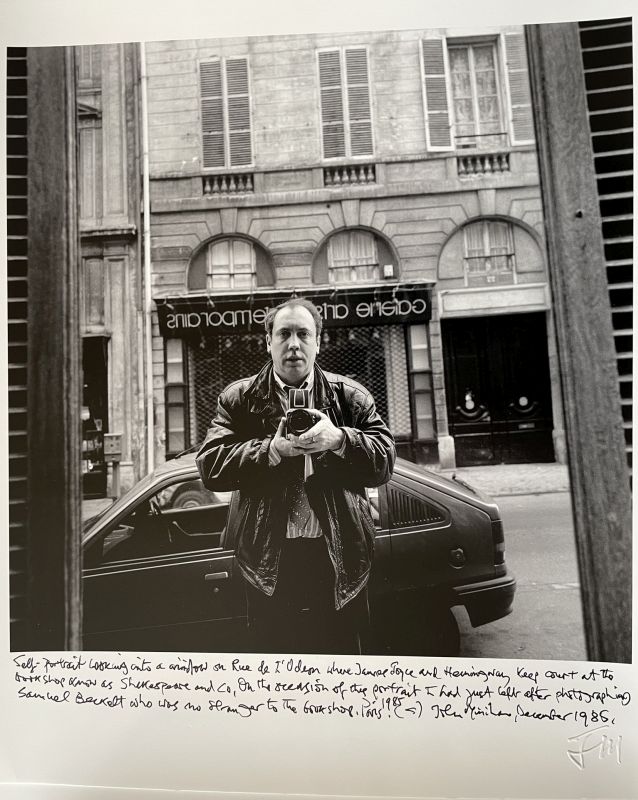 “Self-Portrait – Looking into a window on Rue de L’Odeon where James Joyce and Hemingway keep [sic] court at the bookshop known as Shakespeare and Co., On the occasion of the portrait. I had just left after photographing Samuel Beckett who was no stranger to the bookshop. Paris, 1985.”
