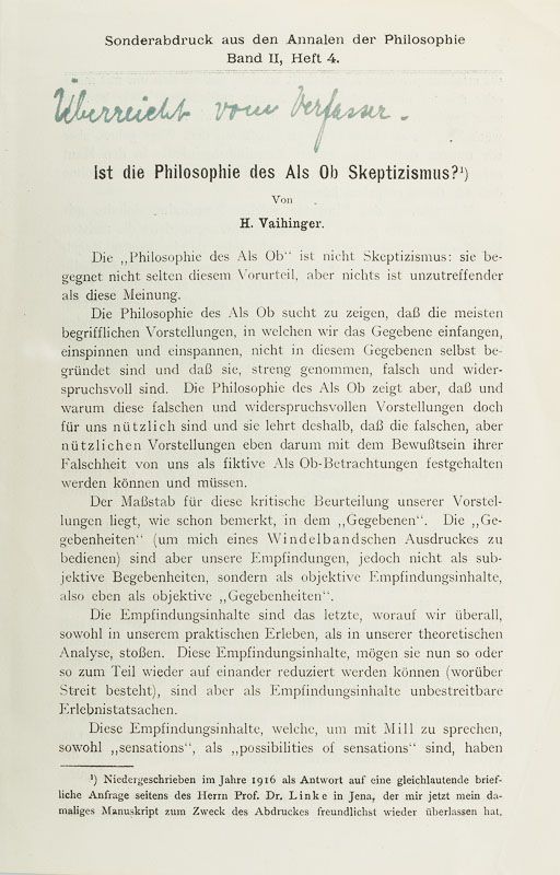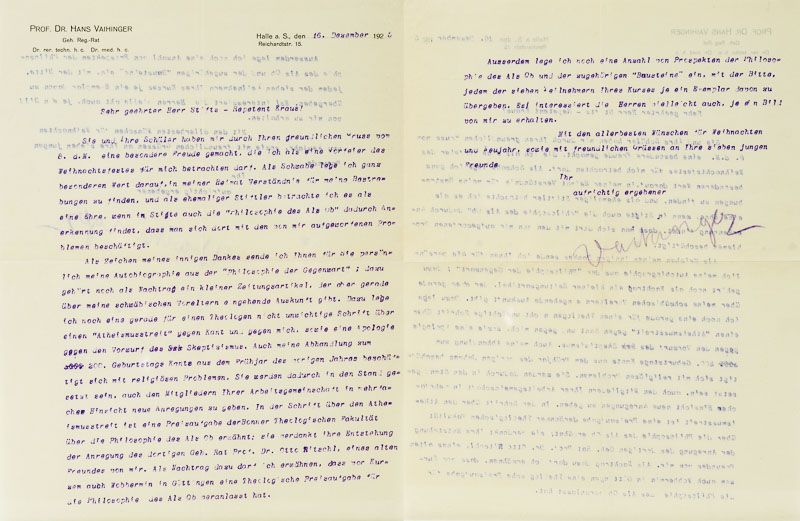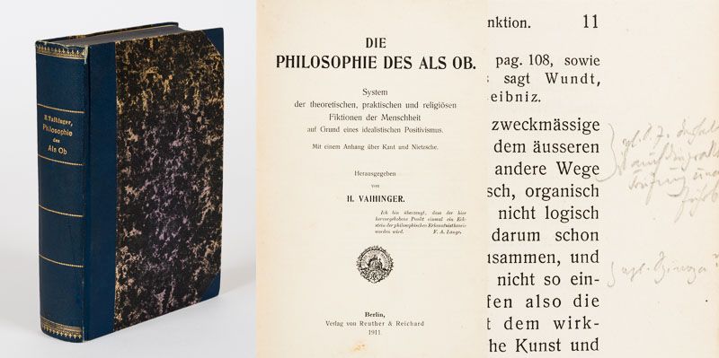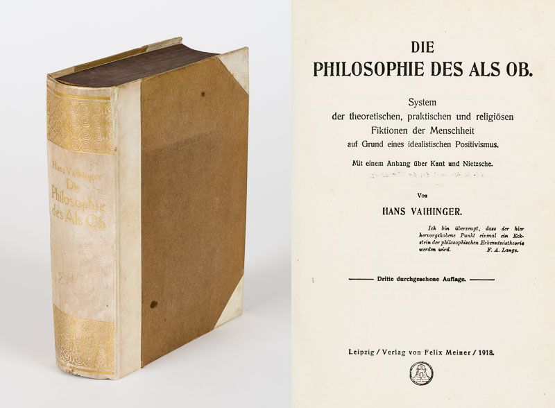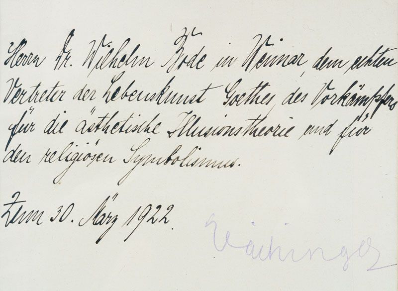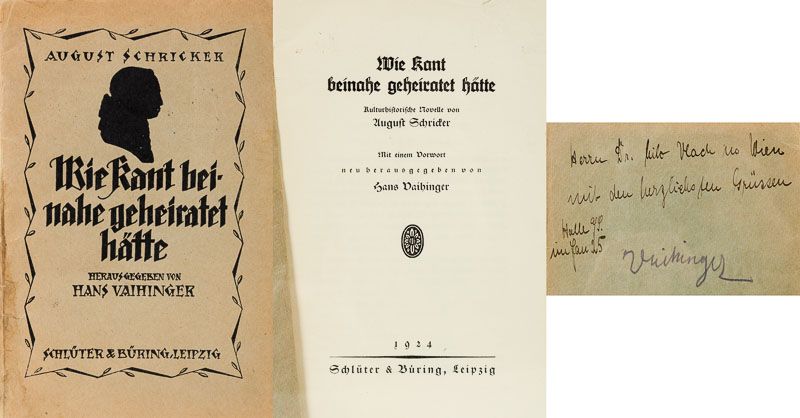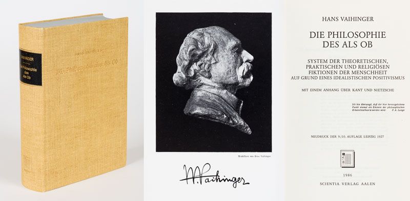 Sammlung bedeutender Ausgaben des Philosophen Hans Vaihinger mit signierten Widmungsexemplaren an den Wiener Philosophen und Vaihinger-Spezialisten Milo Vlach, Kunsthistoriker Wilhelm Bode, signierte Sonderdrucke, ein signierter Brief / (mit zwei Dubletten). Die Sammlung enthält die erste und dritte Auflage seines Hauptwerks sowie einen Neudruck der 9./10. Auflage von 1927: 1. Die Philosophie des Als Ob. System der theoretischen, praktischen und religiösen Fiktionen der Menschheit auf Grund eines idealistischen Positivismus. Mit einem Anhang über Kant und Nietzsche. Erste Ausgabe. XXXV,804 Seiten. Berlin, 1911. Blaues Halbleinen. / 2. Die Philosophie des Als Ob. Dritte, durchgesehene Auflage. XXXIX, 804 Seiten. Leipzig, Felix Meiner, 1918. Dekoratives Halbpergament / 3. Die Philosophie des Als Ob. Neudruck der 9./10. Auflage, 1927 (1986 Scientia). Gelbes Leinen. / 4. Der Atheismusstreit gegn die Philosophie des Als Ob und das Kantische System. Berlin, 1916. Widmung: “Überreicht vom Verfasser” / 5. Der Atheismusstreit gegn die Philosophie des Als Ob und das Kantische System. Berlin, 1916. Signiert: “Primum vivere deinde philosophari – Halle, d. 1.Juli 1921 – Vaihinger” / 6. Pessimismus und Optimismus vom Kantschen Standpunkt aus. Berlin, 1924. Widmung: “Überreicht vom Verfasser” / 7. Wie Kant beinahe geheiratet hätte – Kulturhistorische Novelle von August Stricker. Mit einem Vorwort neu herausgegeben von Hans Vaihinger. Leipzig, 1924. Widmung: “Herrn Dr.Milo Vlach in Wien mit den herzlichsten Grüssen – Halle a/S. im Jan.25 – Vaihinger” / 8. Nietzsche als Philosoph. Feldausgabe. Berlin, 1916 – Widmung: “Herrn Doktorand Miloslav Vlach in Wien mit freundlichem Gruss von H. Vaihinger” / 9. Ist die Philosophie des Als Ob Skeptizismus ? – Widmung: “Freundlichen Gruss, heute, am 100.Geburtstag von Friedrich Albert Lange, dem Vorkämpfer religiöser Selbstbehauptung – Halle, 28.IX.28 – Vaihinger” / 10. Ist die Philosophie des Als Ob Skeptizismus ? – Widmung: “Überreicht vom Verfasser” / 11. Wie die Philosophie des Als Ob entstand. Leipzig, Felix Meiner, 1921. Widmung: “Herrn Dr.Wilhelm Bode in Weimar, dem echten Vertreter der Lebenskunst Goethes, des Vorkämpfers für die ästhetische Illusionstheorie und für den religiösen Symbolismus. Zum 30. März 1922 – Vaihinger” / 12. Nietzsche als Philosoph. Langensalza, 1930. Widmung: “Herrn und Frau Obersekretär Barkhaus mit herzlichen Weihnachtswünschen, überreicht von H. Vaihinger – Halle a/S. im Dezember 1930.” / 13. Zweiseitiger Brief (Schreibmaschine) auf Vaihingers persönlichem Briefpapier, datiert Hale, 16.Dezember 1925. An einen “Herrn Stifts-Repetent Kraus” [Repetent an Vaihingers alter Schule – dem Evangelischen Stift in Tübingen.] Kraus hatte wohl eine philosophische Arbeitsgruppe von sieben Schülern und Vaihinger’s “Philosophie des Als Ob” muss Gegenstand der Arbeitsgruppe gewesen sein und Kraus hat aus diesem Grund mit Vaihinger kontakt aufgenommen. In der ausführlichen Art Vaihingers erwähnt dieser in seiner Antwort an Kraus den Einfluss von Otto Ritschl auf die Entstehung der “Philosophie des Als Ob”, er erwähnt auch Wobbermin in Göttingen und schreibt weiterhin: “als ehemaliger Stiftler betrachte ich es als eine Ehre, wenn im Stifte auch die “Philosophie des Als Ob” dadurch Anerkennung findet, dass man sich dort mit den von mir aufgeworfenen Theorien beschäftigt”.