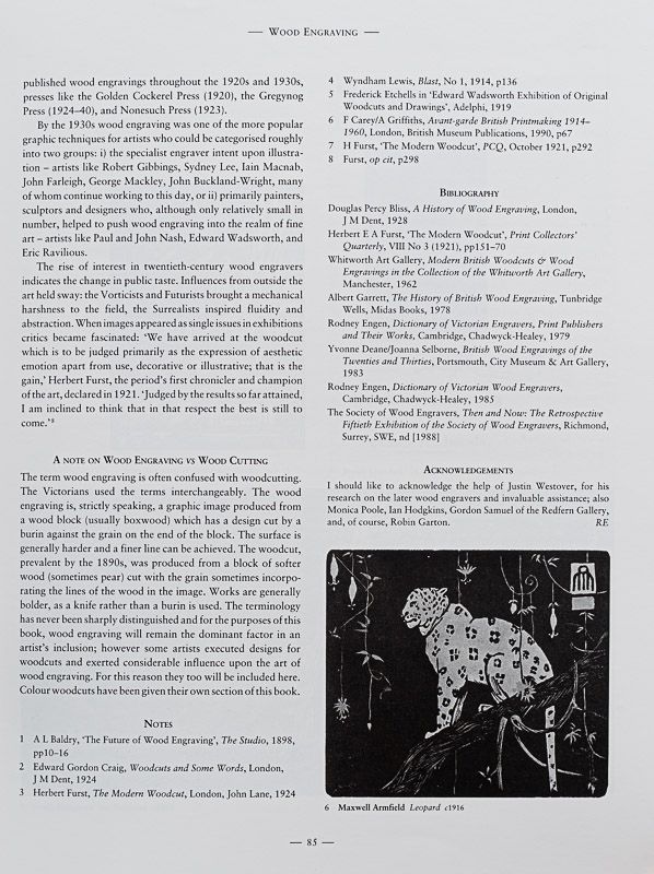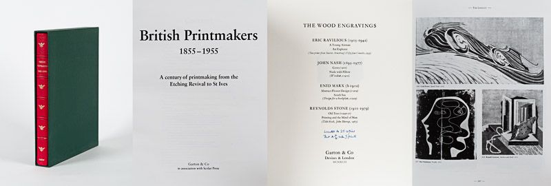 Includes, for example, the following: Introduction / Artist’s Biographies – Chapter One: Wood Engravings by Rodney Engen, art historian and author / Chapter Three: Lithography from c1875 to the 1920s, Prof Kemille Moore, Division of Art, University of North Carolina at Wilmington / Chapter Five: The Linocut, Alan Guest / Chapter Eight: The Monotype, Gordon Samuel, Director of the Redfern Gallery, London / Appendices I: Senefelder Club 1908-1934 – II: World War I Efforts and Ideals 1918 – III: Printmakers who also exhibited at the International Surrealist Exhibition, New Burlington Galleries, 1936 – IV: Contemporary Lithographs 1937-8 – V: Artists’ International Association (AIA): Everyman Prints 1940 – VI: A Salvo from Russia – Surrealist Prints 1942 – VII: World War II – VIII: School Prints 1946-51 – IX: Lyon Prints 1947-55 – X: The London Society of Painter-Printers – XI: Festival of Britain Prints 1951 – XII: Coronation Series 1953 – XIII: Exhibition of Corsham Lithographs at Dartington Hall 1955 – XIV: Guinness Prints 1956-c1957 etc