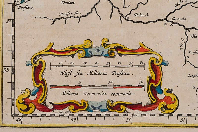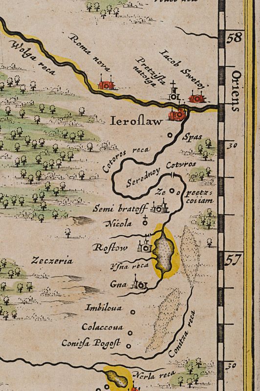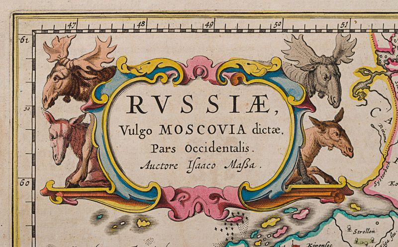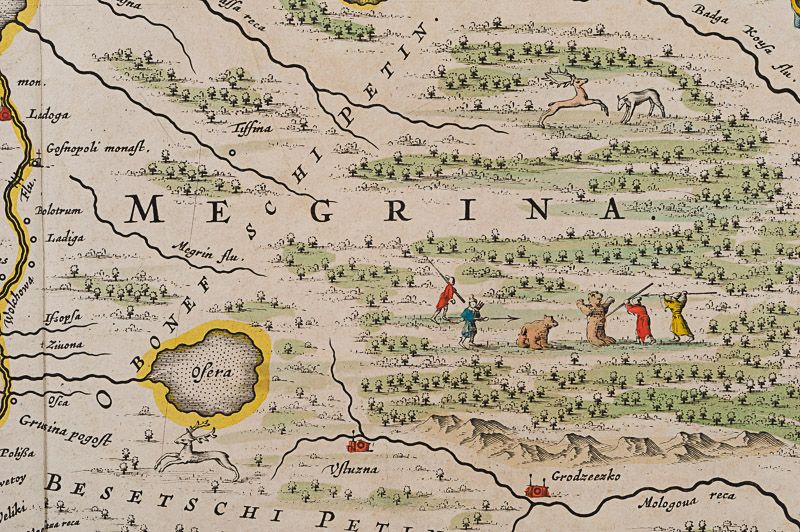 Relief depicted pictorially and the historic place-names are in Latin. The cathedral cities, such as Pereslaw (Pereslavl-Zalessky) and Ieroslaw (Yaroslavl) and Pseskow/Pskouwa (Pskov) are depicted. With numerous deers and foxes seen across the map, the mapmaker indicates that this is a vast region still untamed. In the ‘Megrina’ province the mapmaker shows a bear-hunt at its deadly denouement. The map is covered with forested areas and vast waterways such as the Volga and Volkhov and Daugava/Dvina (‘Duna flu’) Dnieper (Boristenis Flu) rivers and a patchwork of lakes such as Lake Peipus and ‘Biela Osera’ (Rybinsk Reservoir).