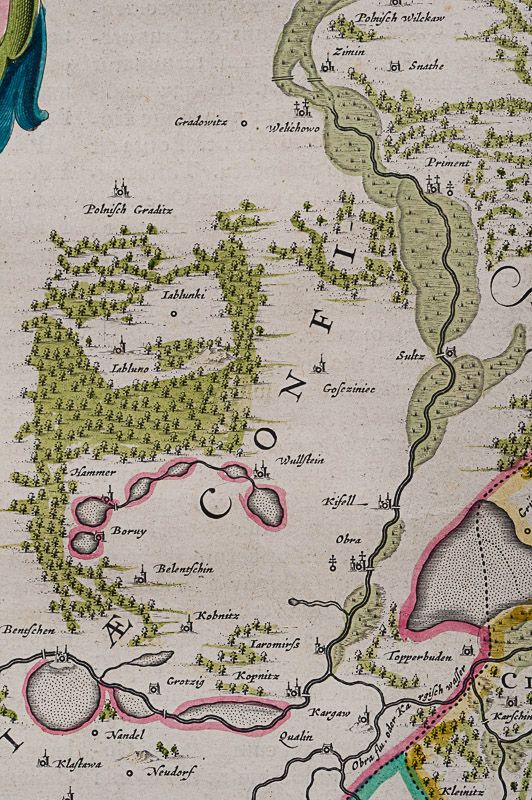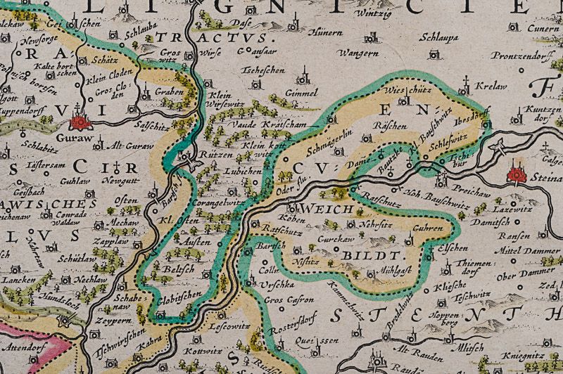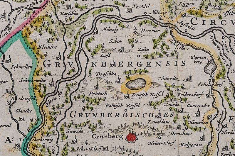 Beautiful and richly detailed map of the Duchy of Glogów/ Glogau in Polish Silesia. Relief shown pictorially. The Oder River dominates the heavily-forested landscape.