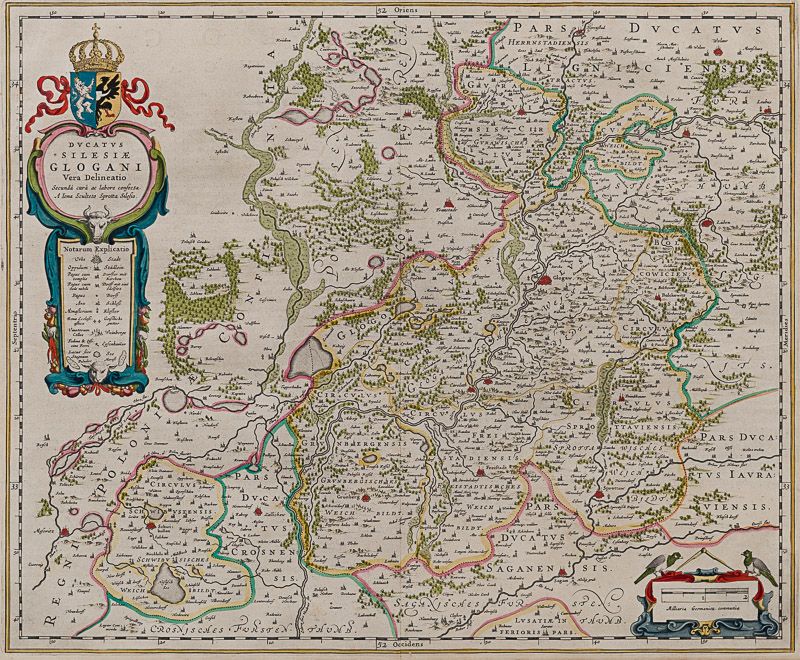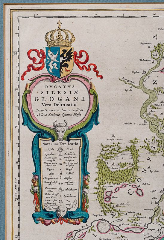 A large decorative title cartouche bear the coat of arms featuring Bohemian lion and Silesian eagle. Explanatory box with map keys also included. In the opposite corner another decorated cartouche contains bar scale.