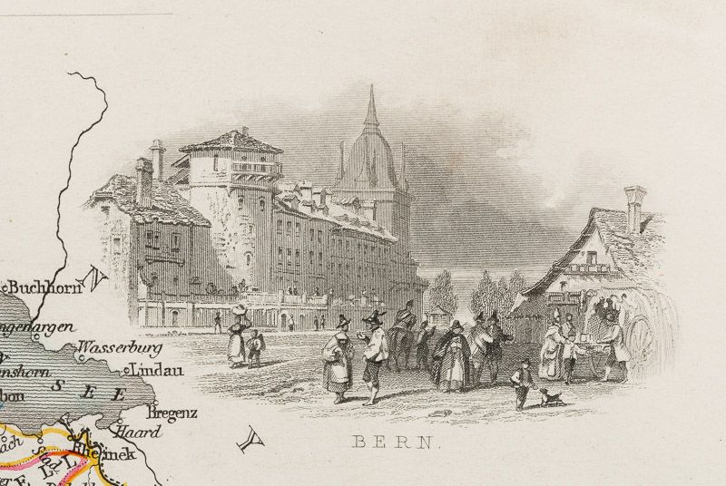Beautiful and interesting map of Switzerland with the political subdivisions delineated. The Swiss Cantons such as Vallais, Zurich and Appenzell are all shown. Cities such as Geneva, Basel and Zurich can all be seen. The Swiss rivers and lakes such as Lake Geneva, Neuchatel, and the Bodensee (Lake Constance) are shown on the map. Relief shown pictorially. France, Germany, Austria and Italy are all bordering Switzerland.