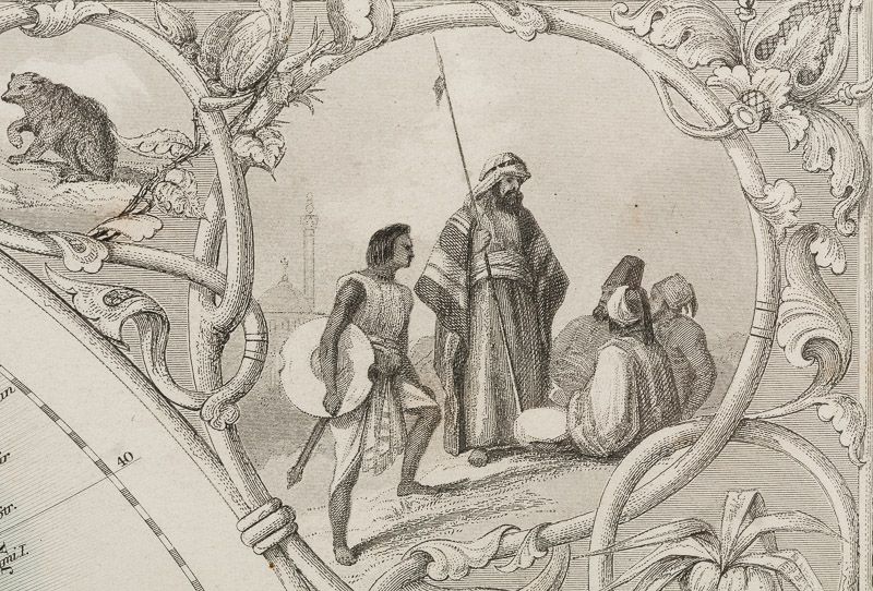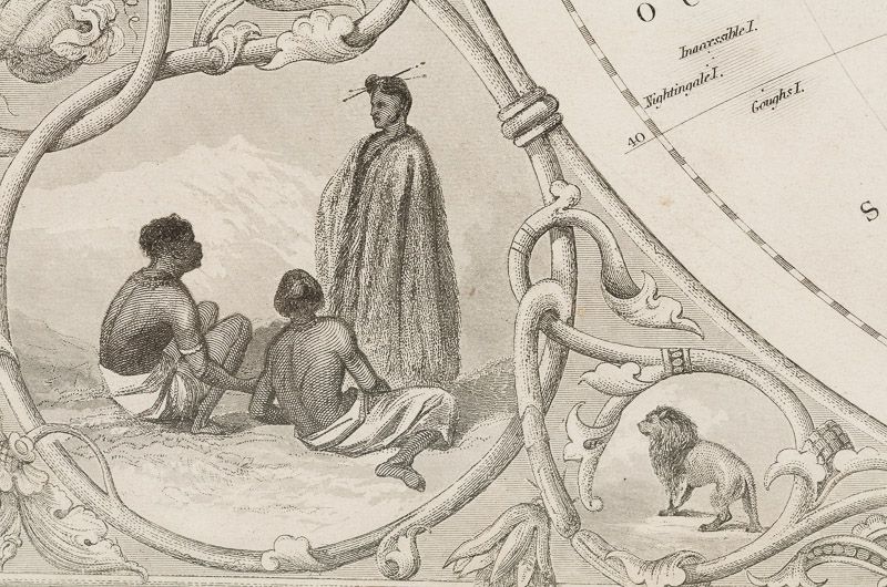 Eastern Hemisphere – With Stunning Vignettes of Indigenous Peoples, Native Animals inlaid within an Ornate Decorative Border.
