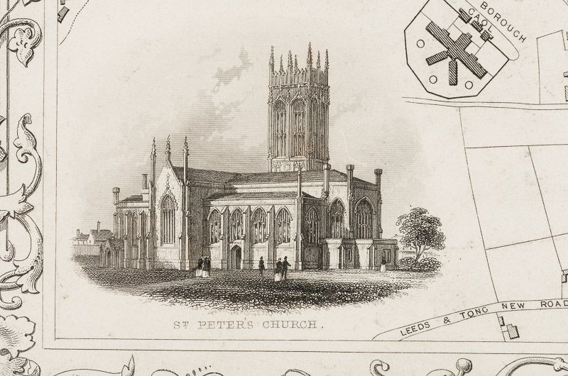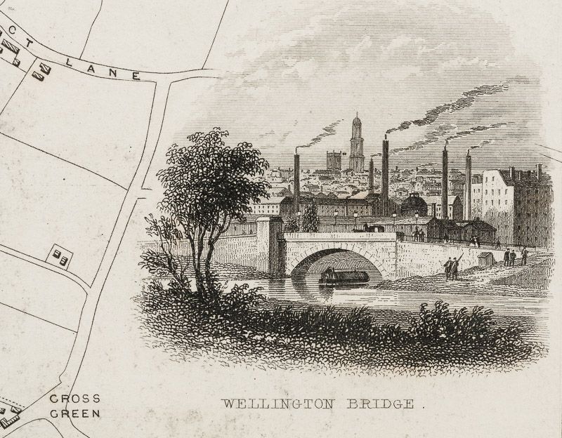 Leeds – With Vignettes of St Peter’s Church, Town Hall Cemetary Woodhouse, Mill Hill Chapel, Kirkstall Abbey, Wellington Bridge, and New Gaol.