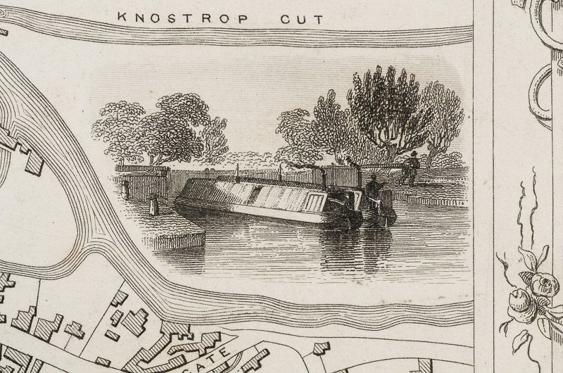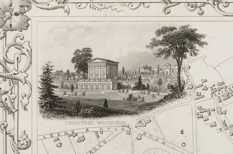 Handsome town-plan of Leeds, West Yorkshire in Northern England,. The River Aire can be seen running through the city. Canals railways, street and district areas of the city are also included. Decorative scrolling and title cartouche around the edges of the map. One of the few double page plans published by Tallis.