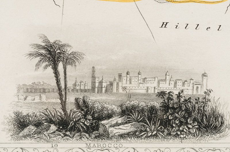 The most important project John Tallis undertook, was the ‘Illustrated Atlas’ from 1851. The original map we offer here, was part of this exceptional Atlas and all the maps it contained are still today considered as the last reminder of an era of lavish map production. Tallis worked the project together with John Rapkin (1815-1876) and it was Rapkin’s style and talent that we have to thank for when we marvel at these maps today. What makes these maps so special is the detail of engraved vignettes that surround the map and often show indigenous scenes, people in their environment and even more so, historical buildings or historical views of towns and cities, architecture and landscape.