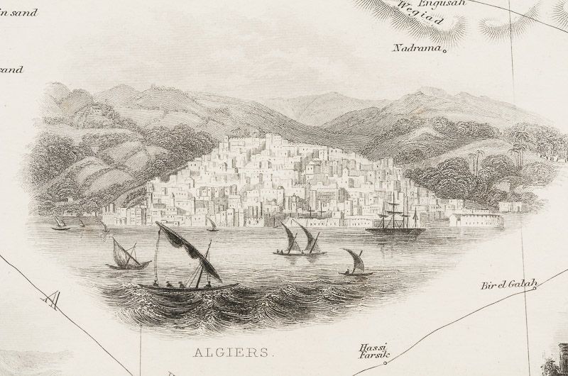 Northern Africa with Algeria, Marocco and Tunis and showing the Street of Gibraltar with southern Spain – with Vignettes and illustrations of Mogador / Marocco [Marokko] / Constantine [Constantinople / Istanbul] / Algiers / Tunis.