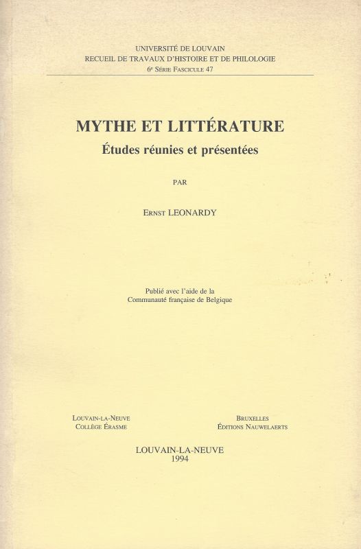 Julien Ries – Le Mythe, son langage et son message / Pierre Brunel – Mythe et littérature / Ernst Leonardy – Loreley et ses consoeurs / Hans-Joachim Lope – Le mythe de Don Juan dans la littérature francaise de Belgique / Chantal Zabus – Athènes noire ou les Baccantes Yorubas / Fernand Corin – “Twee vrouwen” de Harry Mulisch – Mythe ou réalité / Myriam Watthée-Delmotte – Narcisse vu par Dali: une métamorphose poétique et picturale du mythe etc.